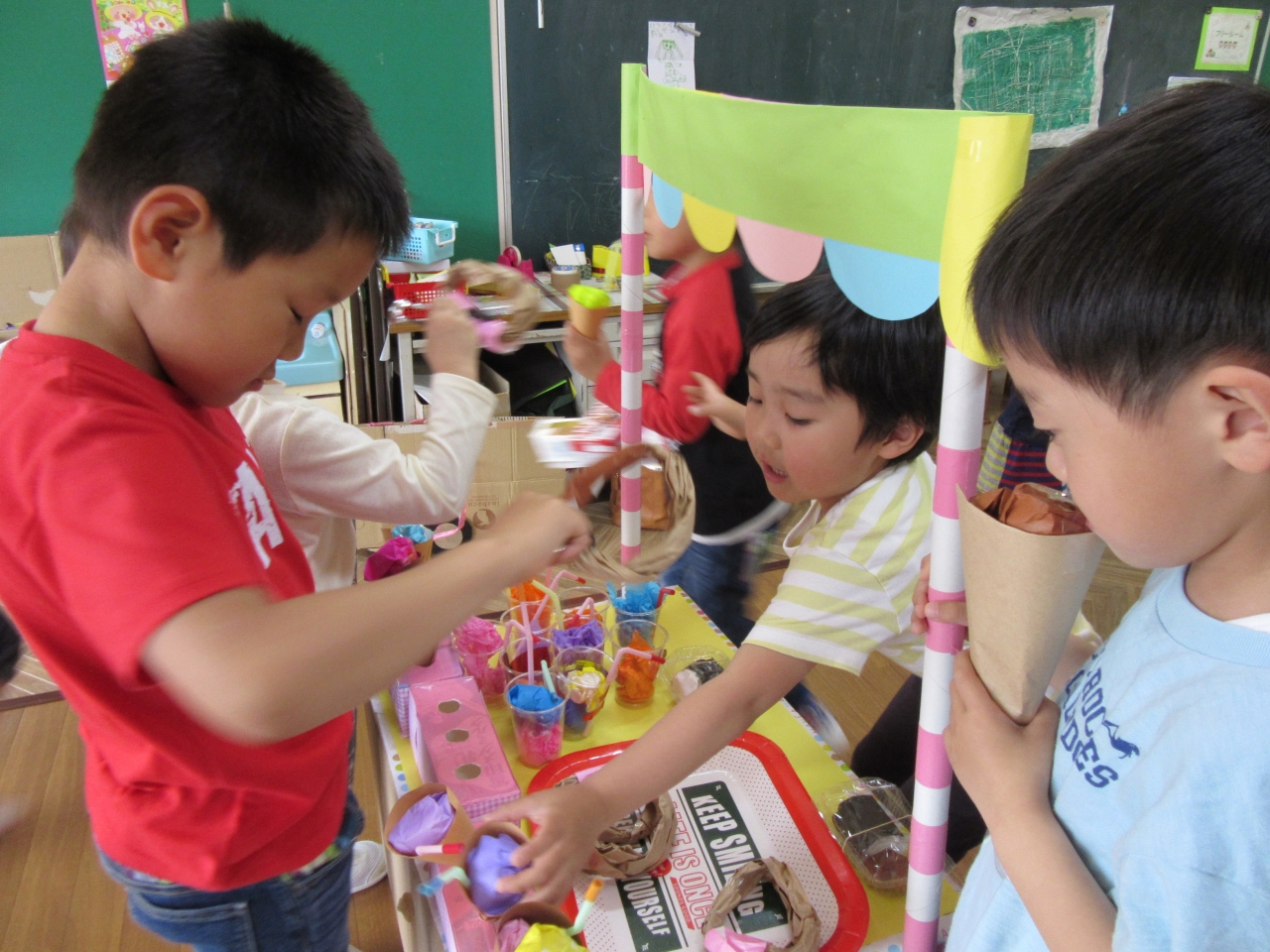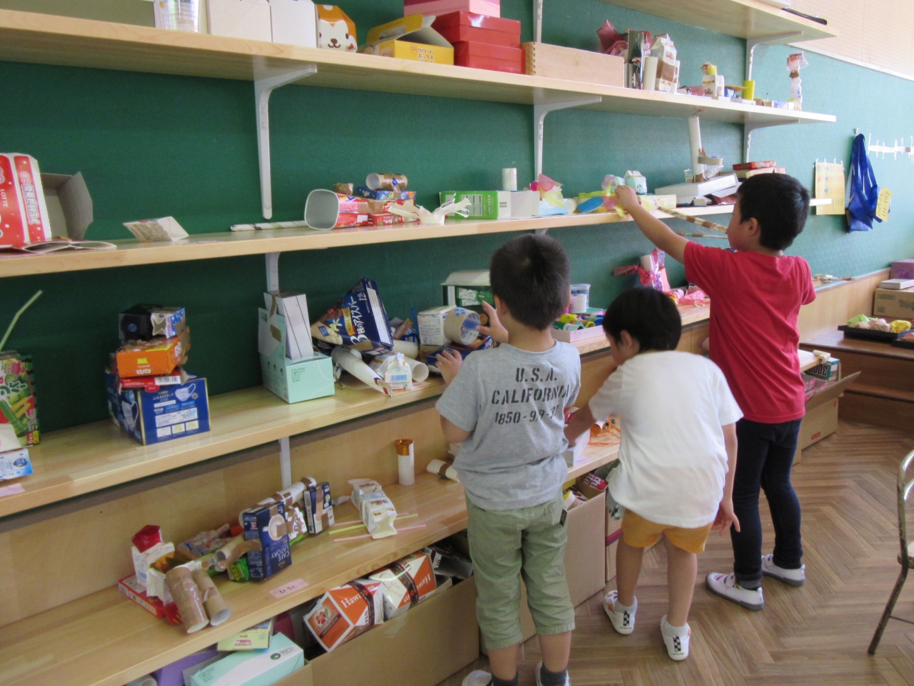 空き箱などで工作をしたり、お店屋さんごっこをしたり。継続した遊びを続けることができるお部屋となっています。