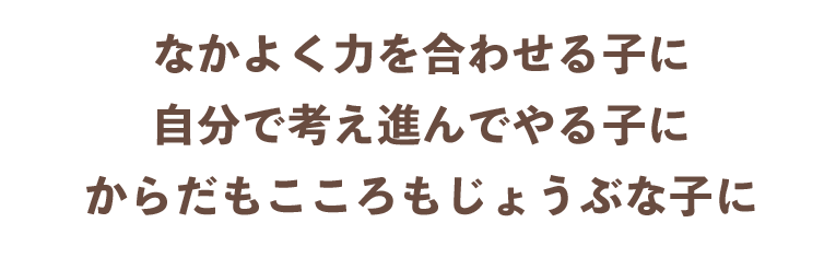 興味があること、大好きなことを、こどもたちが自ら選び取り、「あそび」の中で様々な実体験を通して「人とのかかわり」や「自分の思いを表現する喜び」を学びます。そういった中で、自分自身に自信をもち、自分を大切に思い、自己決定のできる人間形成を目的としています。