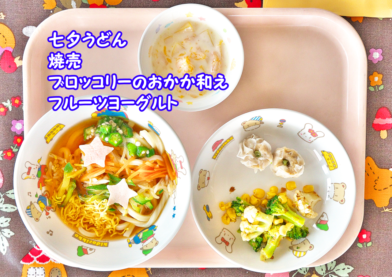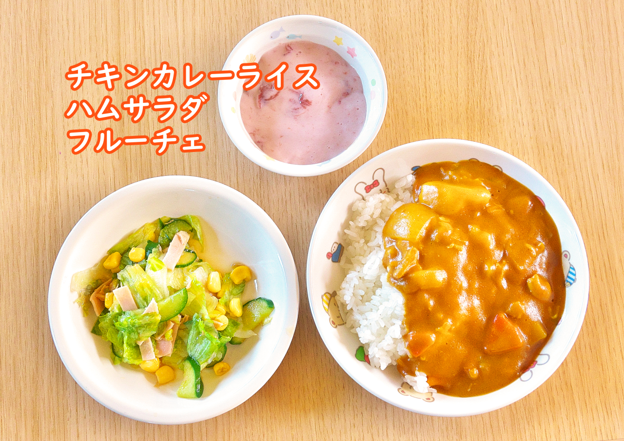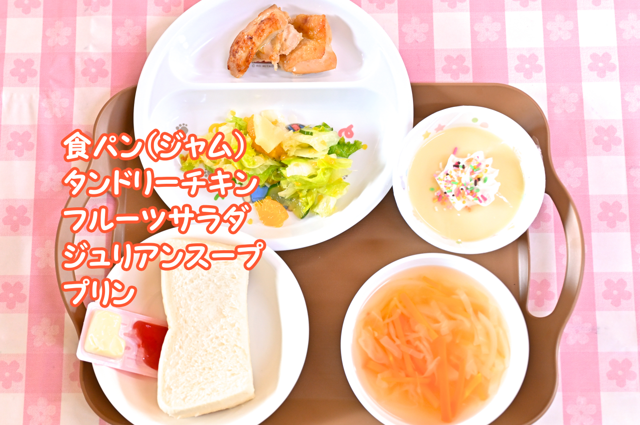 お昼ごはんは、園舎内の給食室で調理された完全給食(パンまたは米飯、おかず、牛乳)となります。できたての温かい給食は子どもたちにもとても好評で、毎日楽しみにしてくれているようです。時には「すくすく農園」の収穫物を活用してもらうこともあり、それぞれが食べものについて考える大切な機会でもあります。
