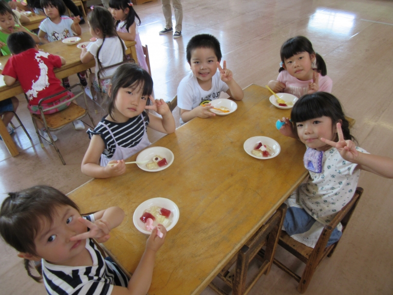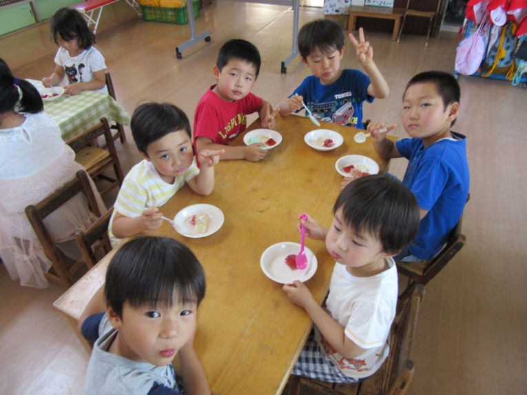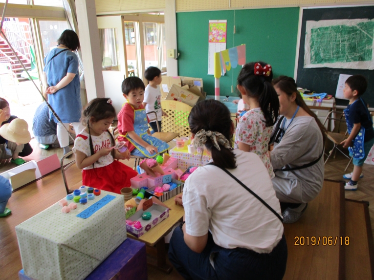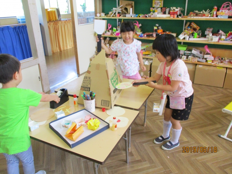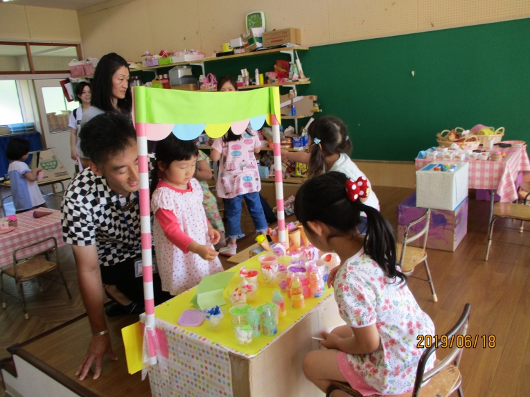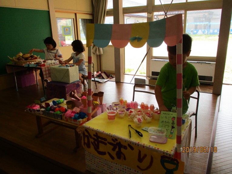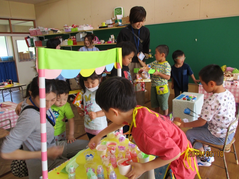 「いらっしゃいませ~」とエプロンをつけて売り子になったり、アイスのチケットを配りに行ったり、楽しく遊んでいた子どもたちお家の方もたくさん買いに来てくれましたね