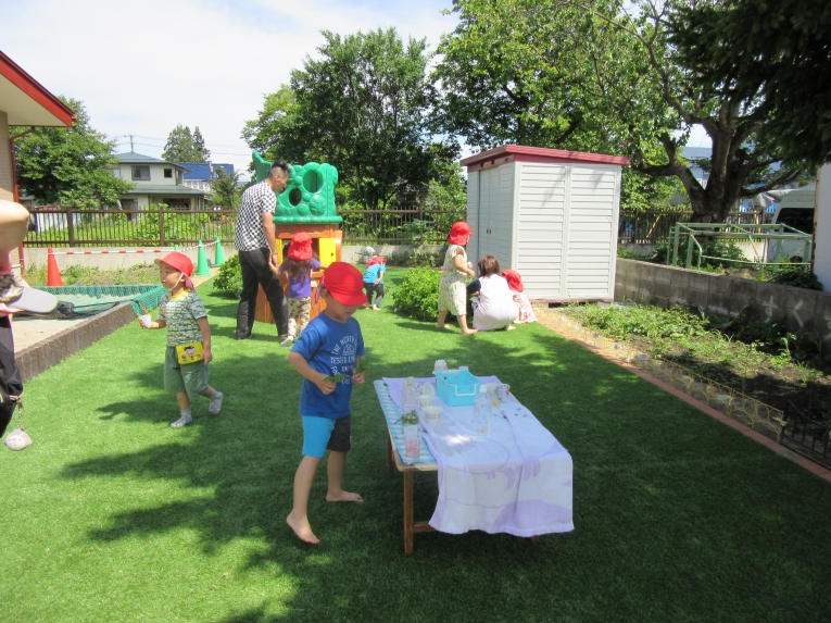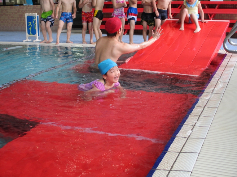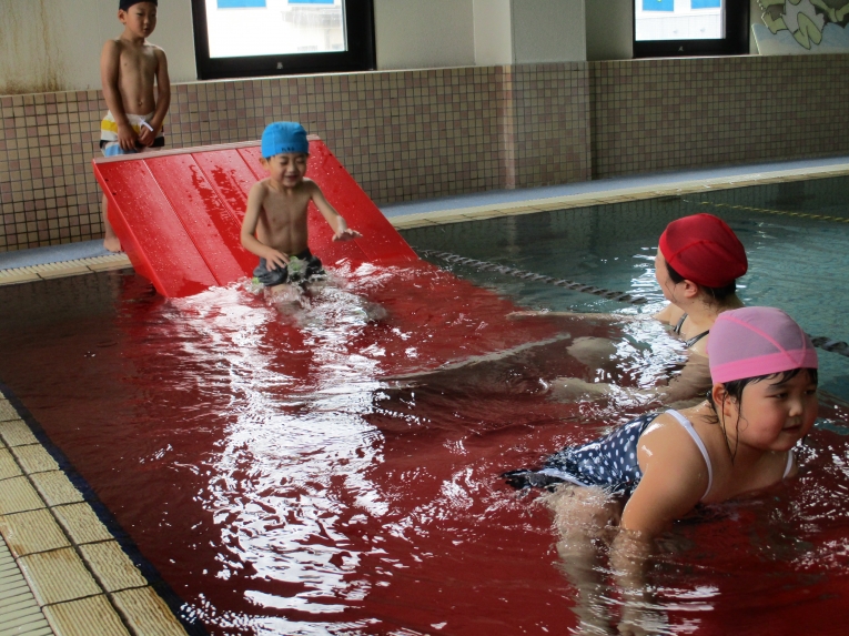 最後には滑り台で水の中にジャバーン!はじめは怖かった子どもたちも何回もやりたくなって何回も挑戦していました