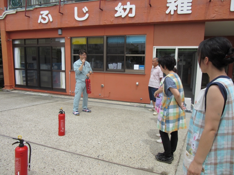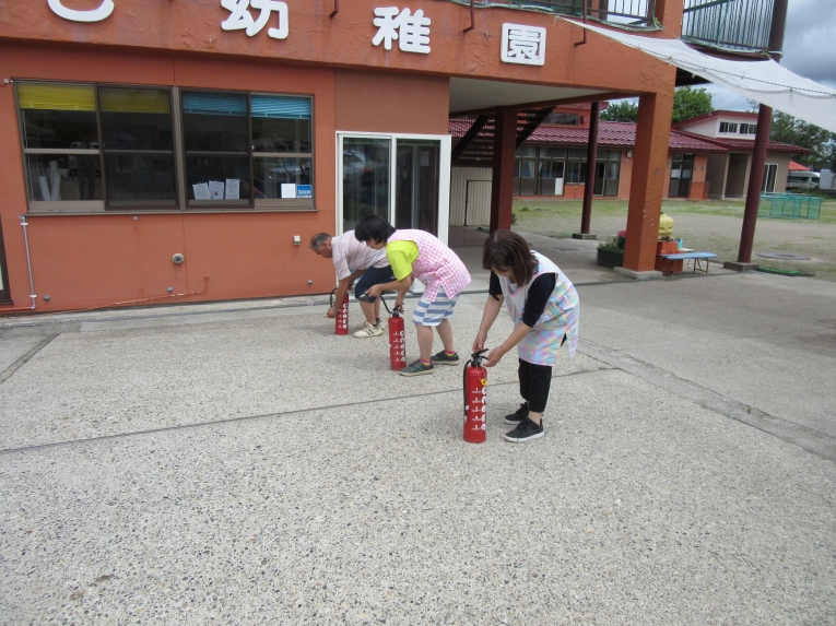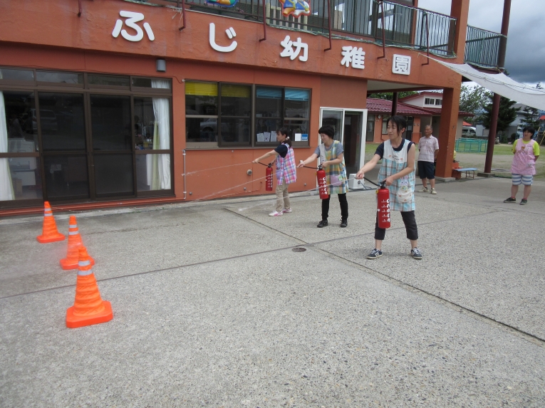 それから実際に消火訓練をします。今日は「水」の入った消火器。本当はピンクの消火粉が入っているそうです。