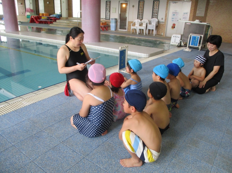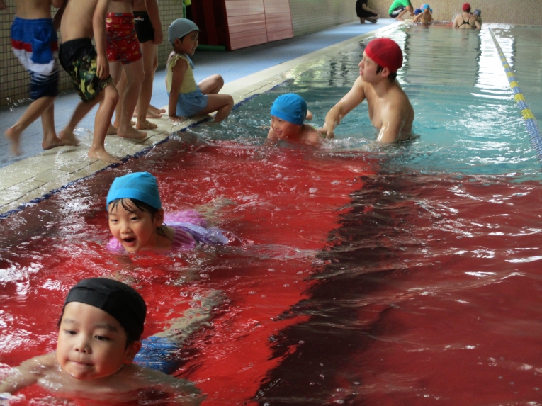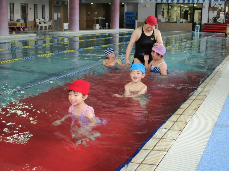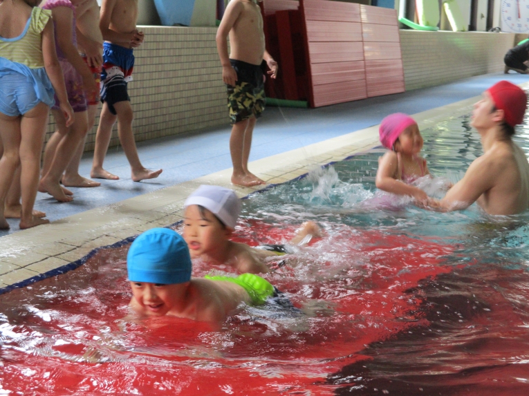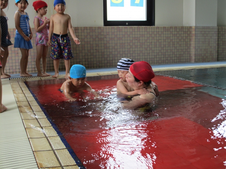 いよいよ体全部を水のなかへ・・気持ちよくて楽しくて自然と笑顔になっていました(*^^*)コーチに続いて水の中を歩いたり、手をついて前に進むワニさん歩きをしたり、歩く途中に落とし穴があり落ちないように先に進むなどいろんなことに挑戦しました