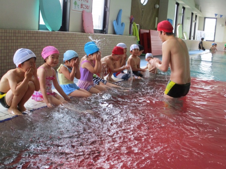 はじめは足だけを水につけ、手で水をすくったりすくった水を顔につけたりしました!少しずつ水に慣れていくと、うつ伏せでのバタ足では思い切りバタバタさせ水を浴びる子どもたちです