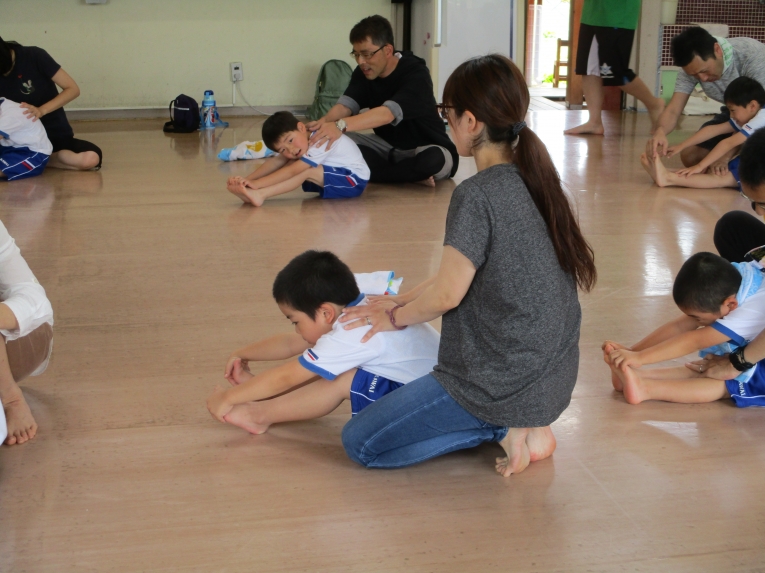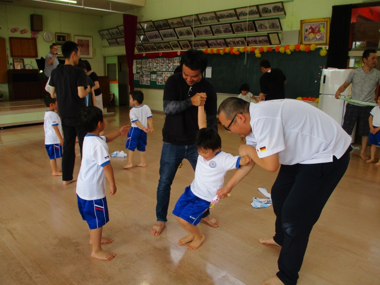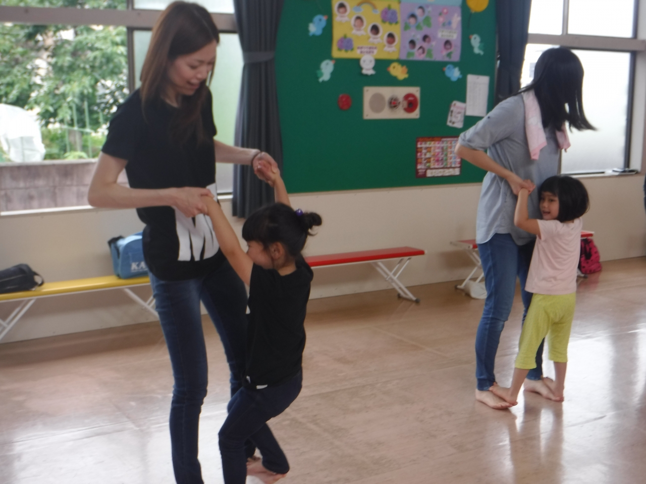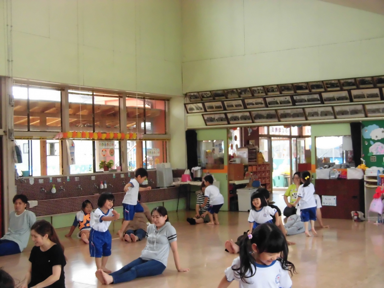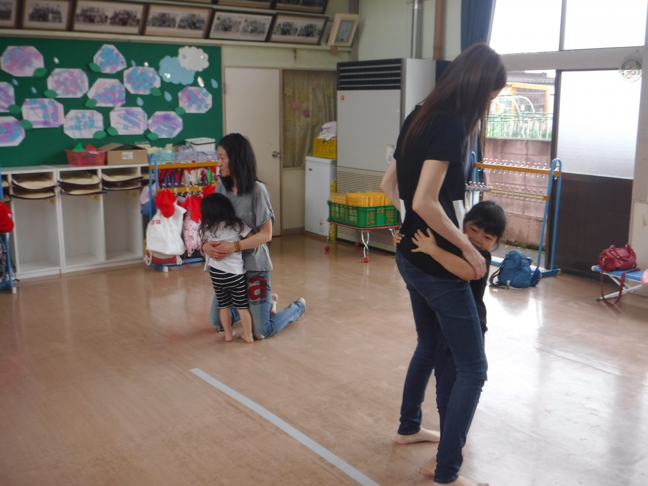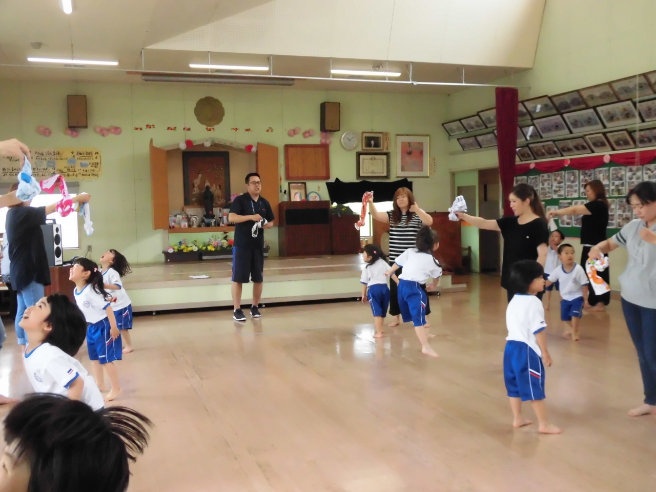 年長組さんの体操教室でお世話になっているカワイ体育教室の講師の先生をお招きして、親子で楽しめる体操をたくさん教えていただきました。