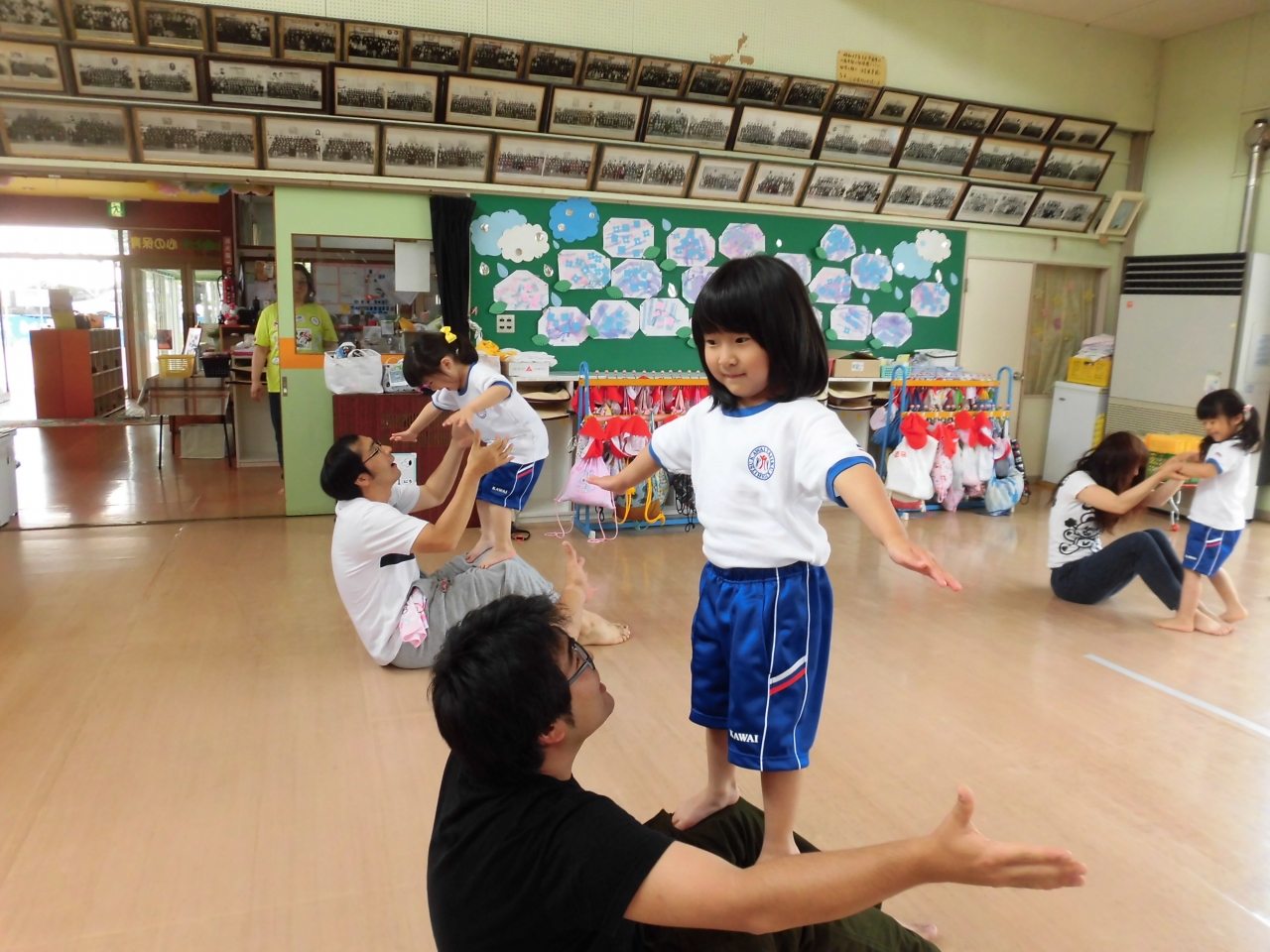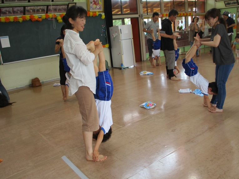 年長さんは逆立ちしてお父さんお母さんの足に乗り、歩いたりもしたね
