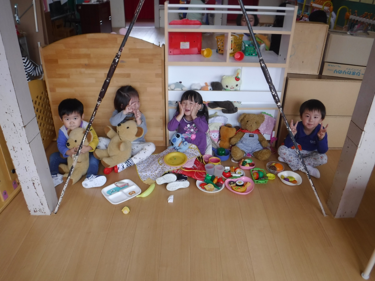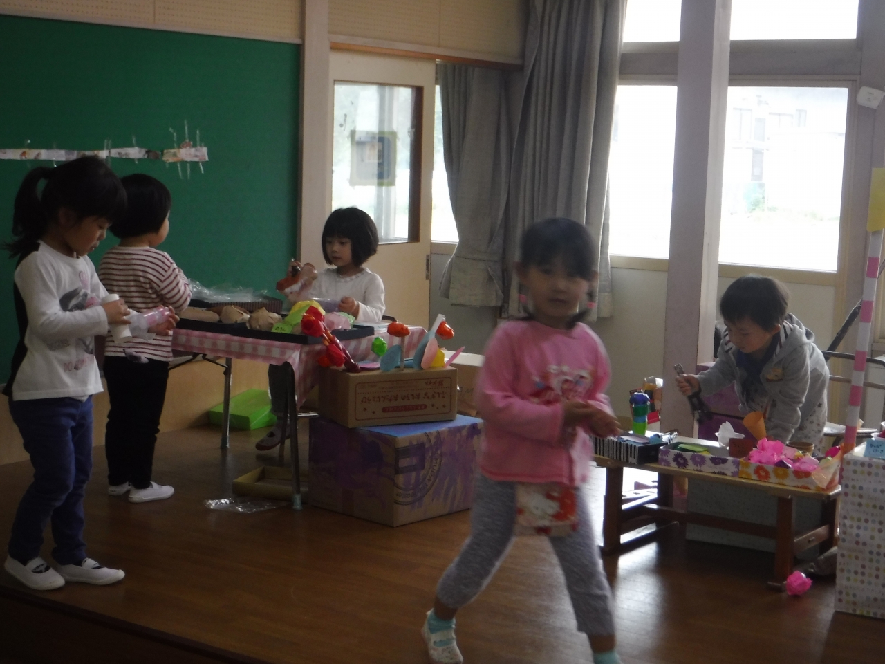 今日のフリールーム「お店屋さんやさんごっこ」中心に楽しみました隅の方では、積み木遊びに夢中なお友だちもいましたね