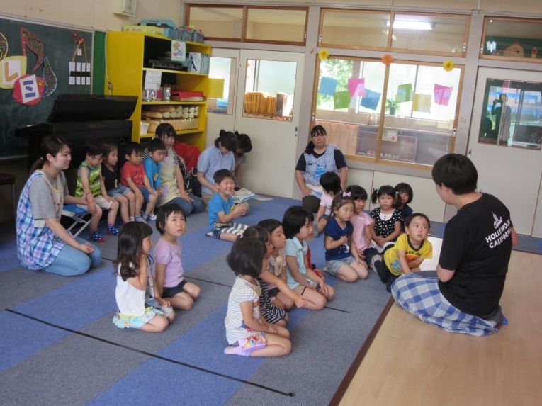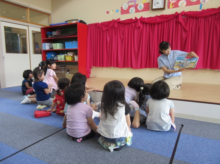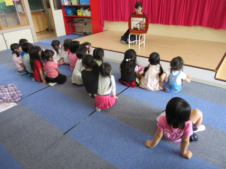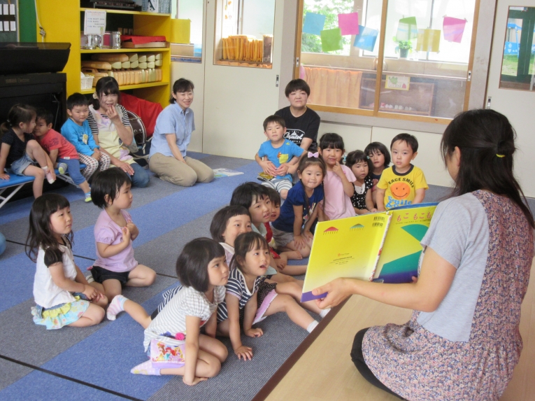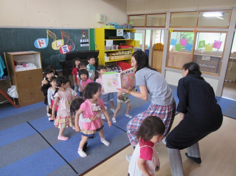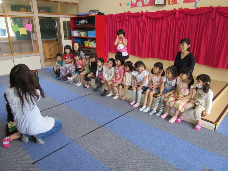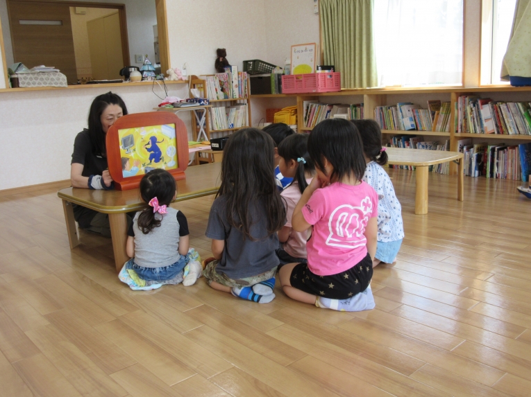 今日は9時半から「読み聞かせ会」がはじまります~♪ と呼びかけると、来ました 来ました 絵本の大好きな子どもたち 初めは手遊びから・・・