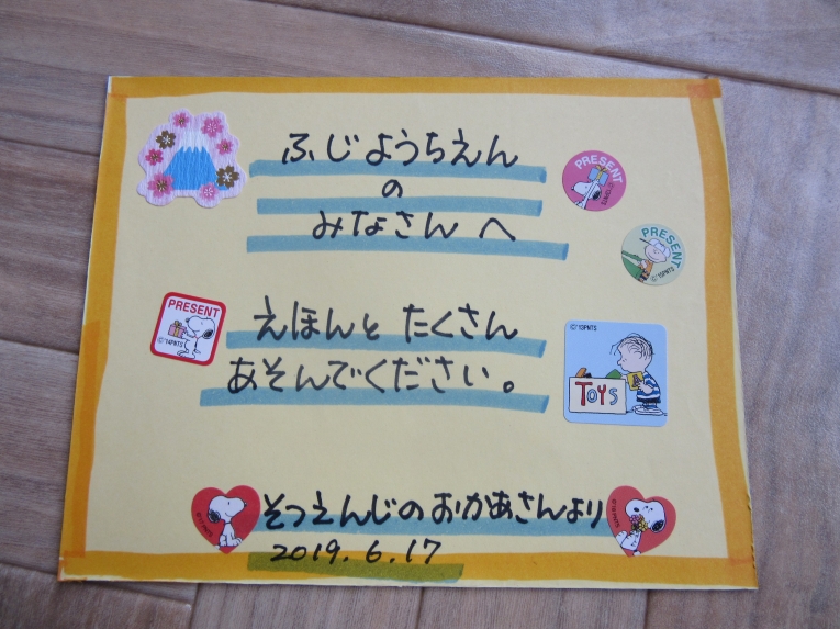 もう、大人になった卒園生のお母様からのプレゼントです。ずっとずっと幼稚園を大切に思っていてくださっているんだなあ・・と感謝でいっぱいです ○○○さん!!本当にありがとうございました