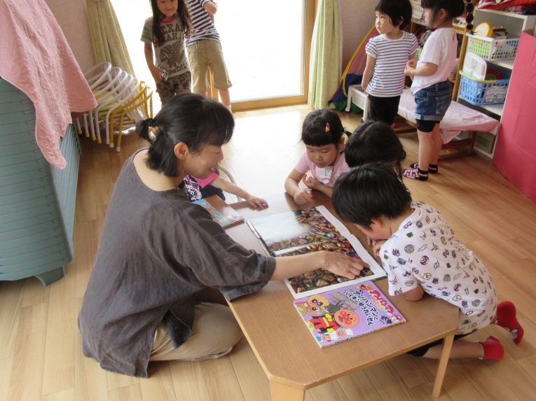 「読んで~~」と、次々に絵本を選んで手に手に持ってくる子どもたち・・ 大好きな絵本を自分で見たり、読んでもらったり、お友だちと見合ったり・・・