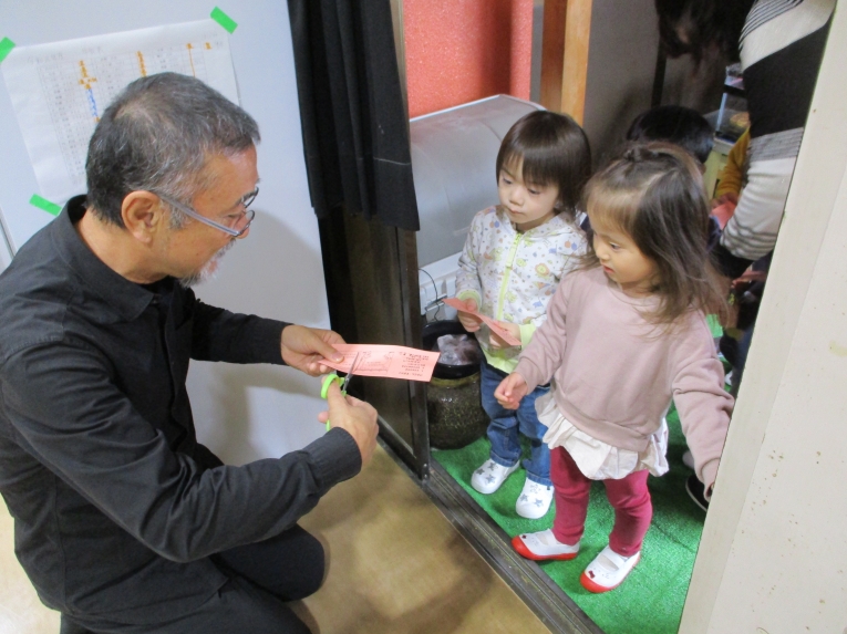 先ずは「開場体験」。ひとりひとりチケットを持って、劇団の役者さんに「切符もぎり」をしていただきました。