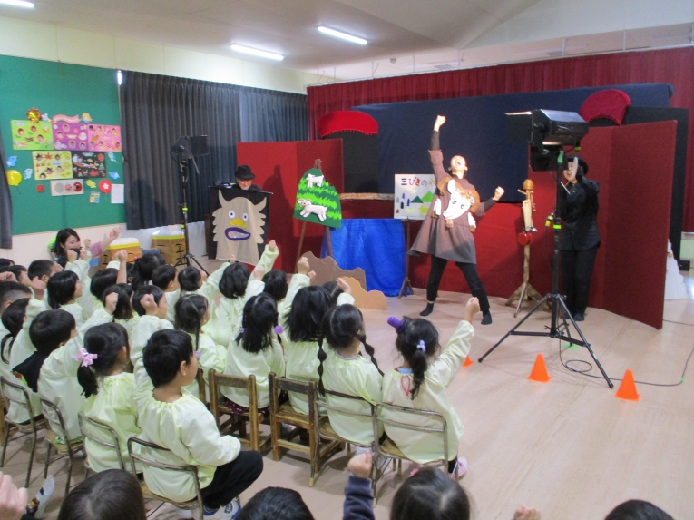 初めは「3匹のやぎのがらがらどん」 役者さんの張りのある声が、響き渡って迫力満点!
