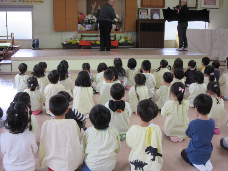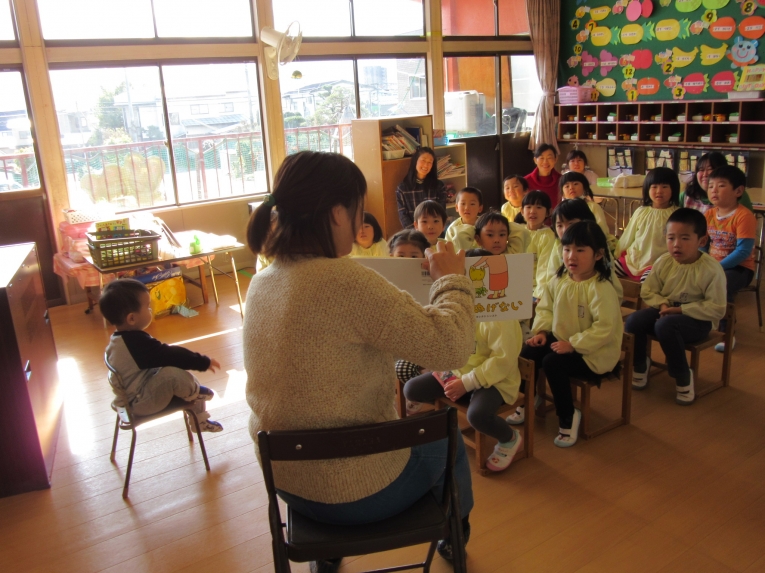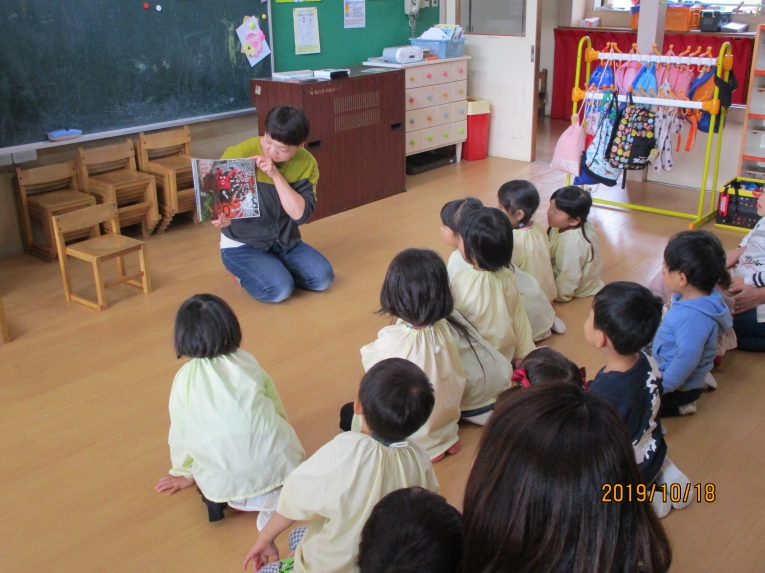 初めは「年少:ほし組さんと満三歳児クラス・ひよこ組さん」での読み聞かせ会です~