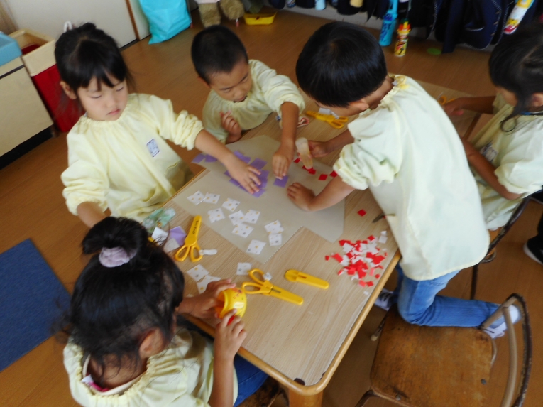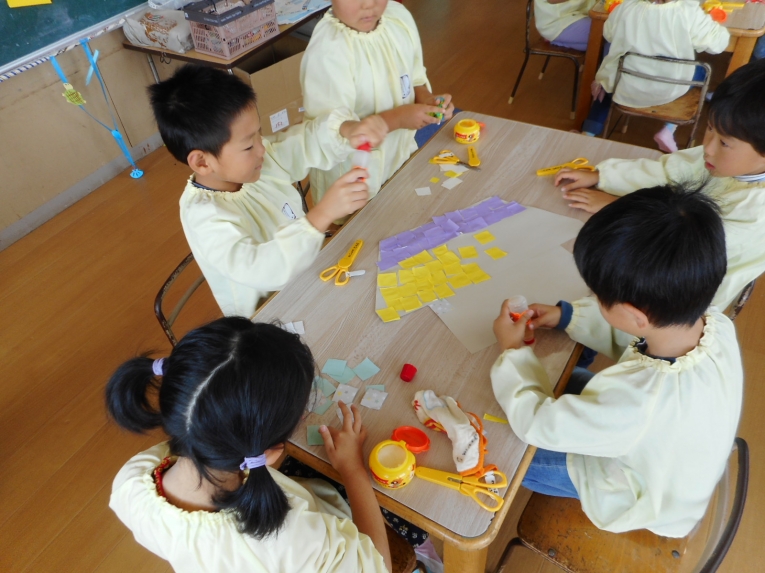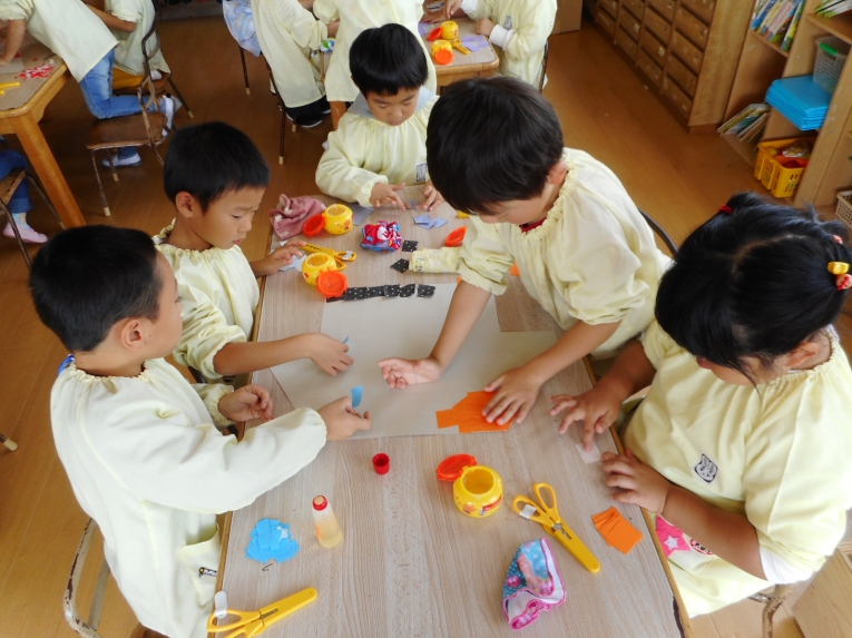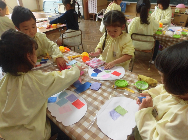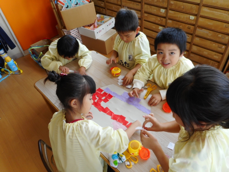 グループごとに、船の上、真ん中、下の3つの色を選び、ちぎり貼りに挑戦しました