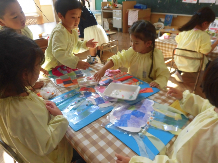 かさには、お花紙の色を選んで、ペタペタ足には、ビーズや貝殻を好きなようにちりばめました。
