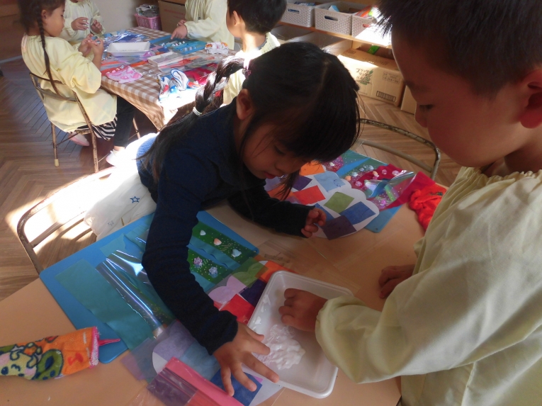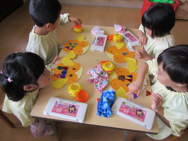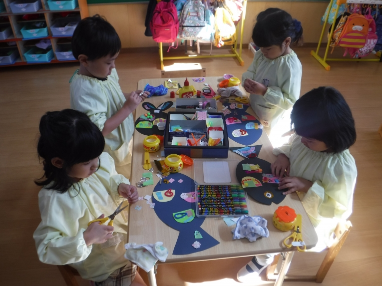 様々な素材から、選んでコラージュ遊び!!シールや、千代紙など自分で好きなように並べて、ウロコを作りました!!