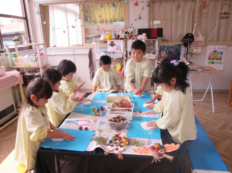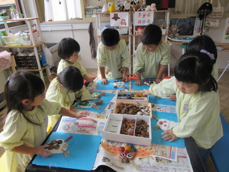おなかの部分は、着色したとちの実の皮を、並べたよ!!