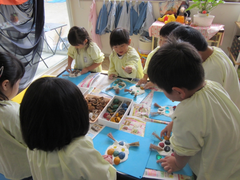 自然物や、ペットボトルのキャップなど、様々な素材の中から、自分で選んで、お顔を作ったよ!