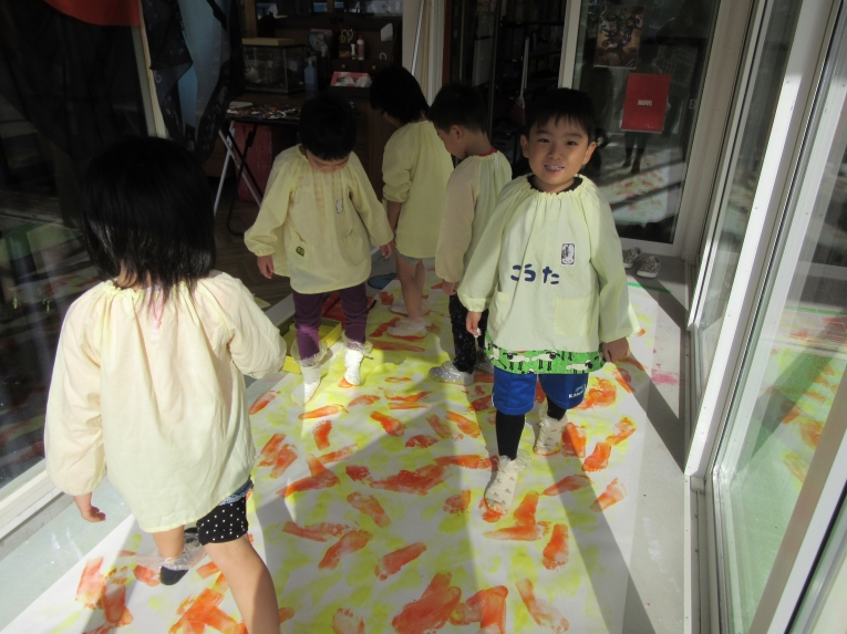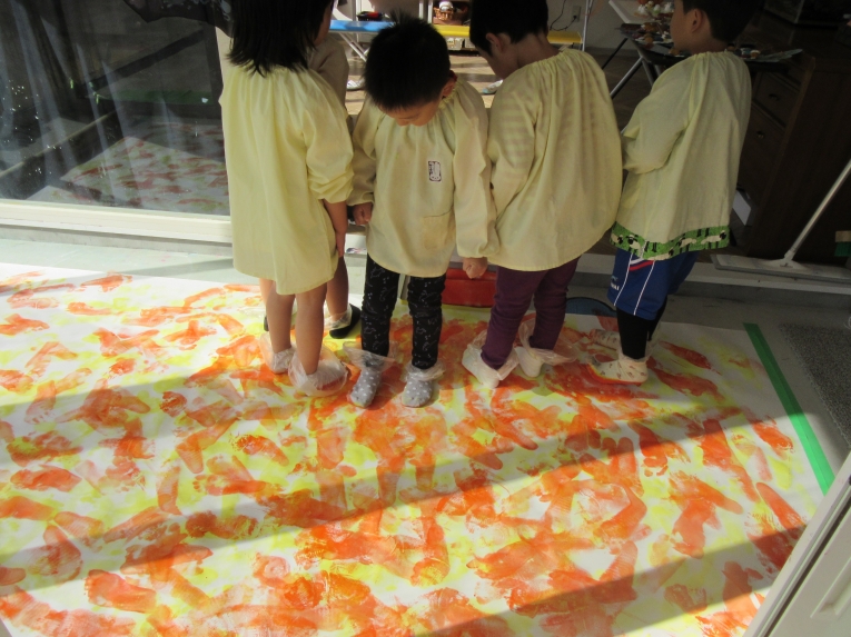 背景の山は、アトリエでの、足スタンプです