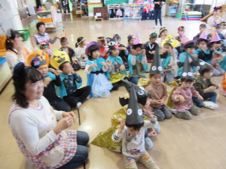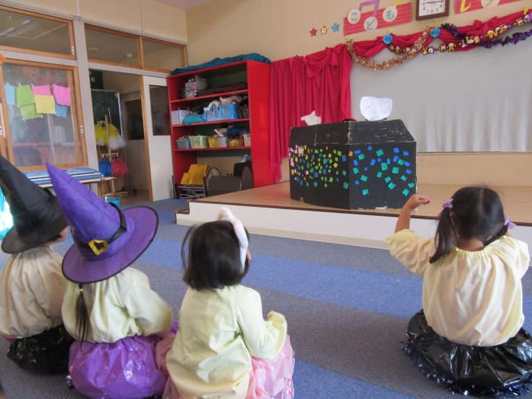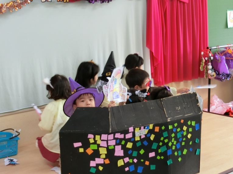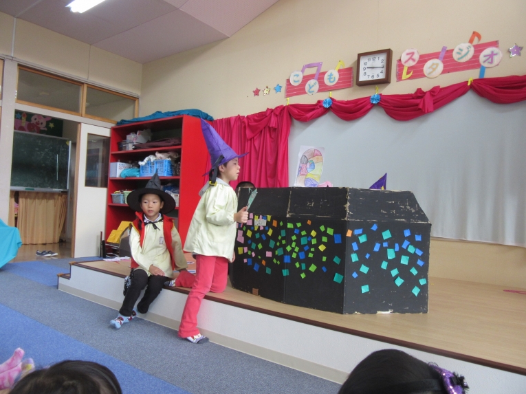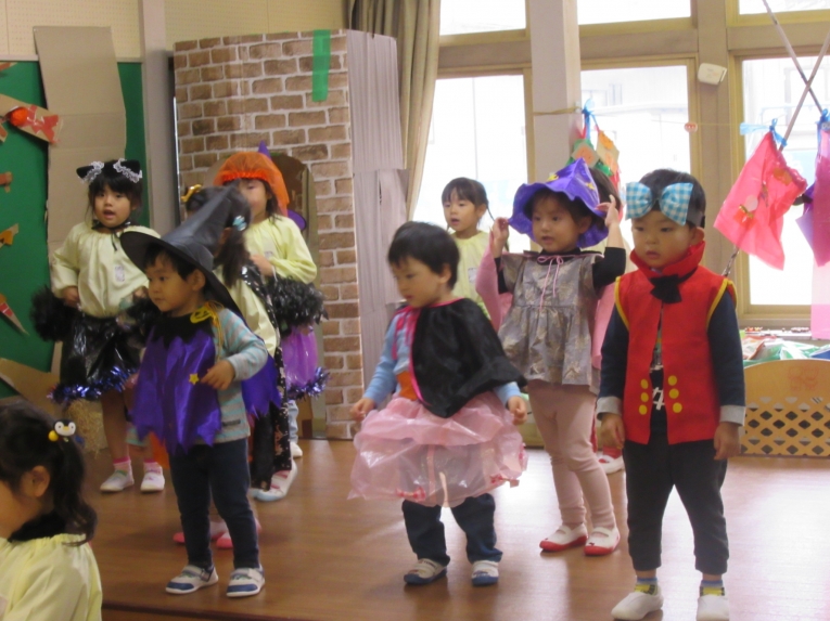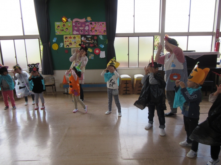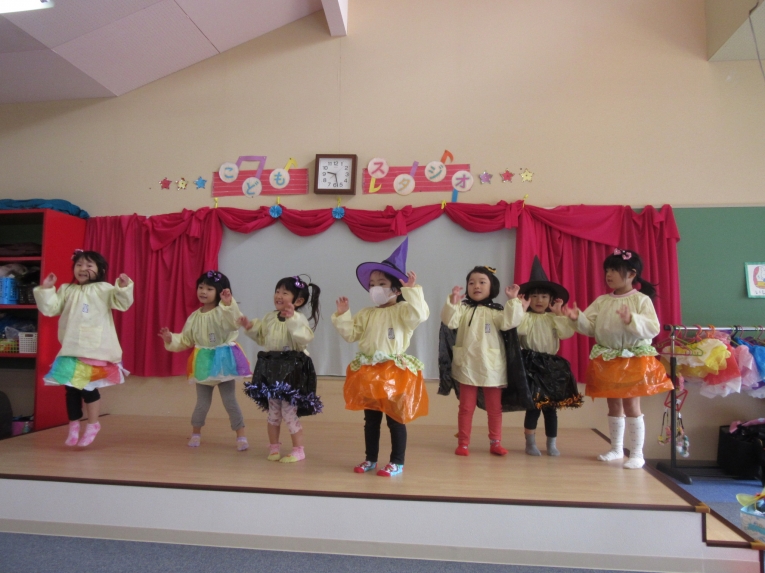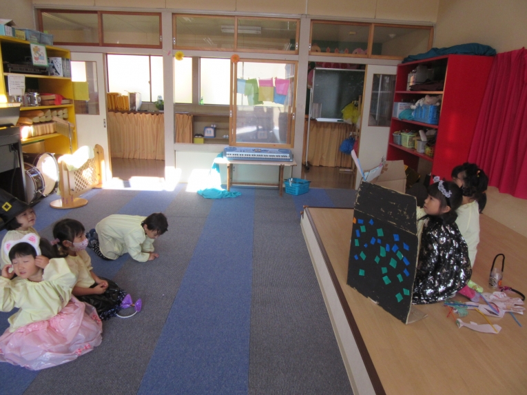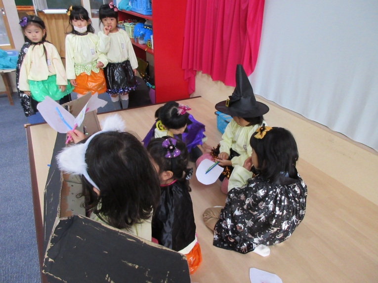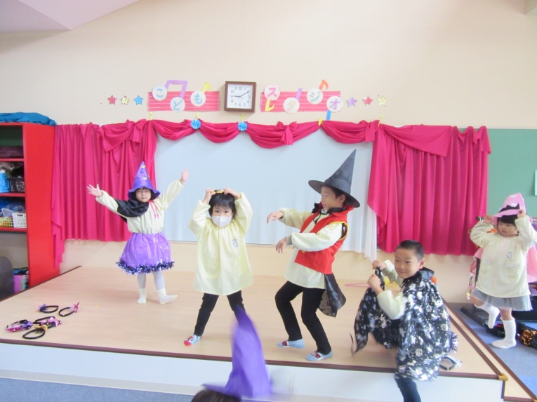 こどもスタジオでは、衣装を身につけ、「おかしなハロウィン」を踊ったり、年中さんから始まった「おばけマンション」のペープサートを演じたり、お客さんになったり・・・