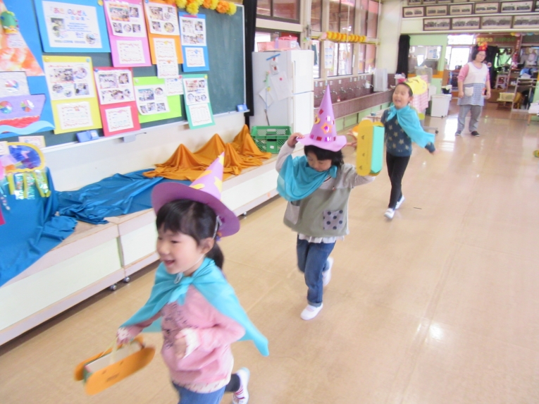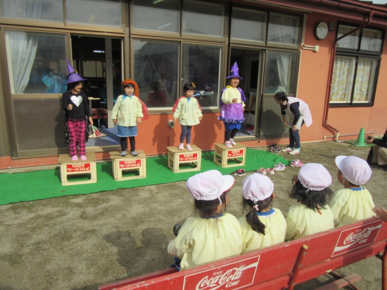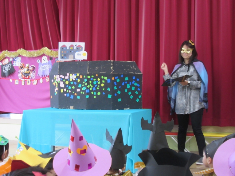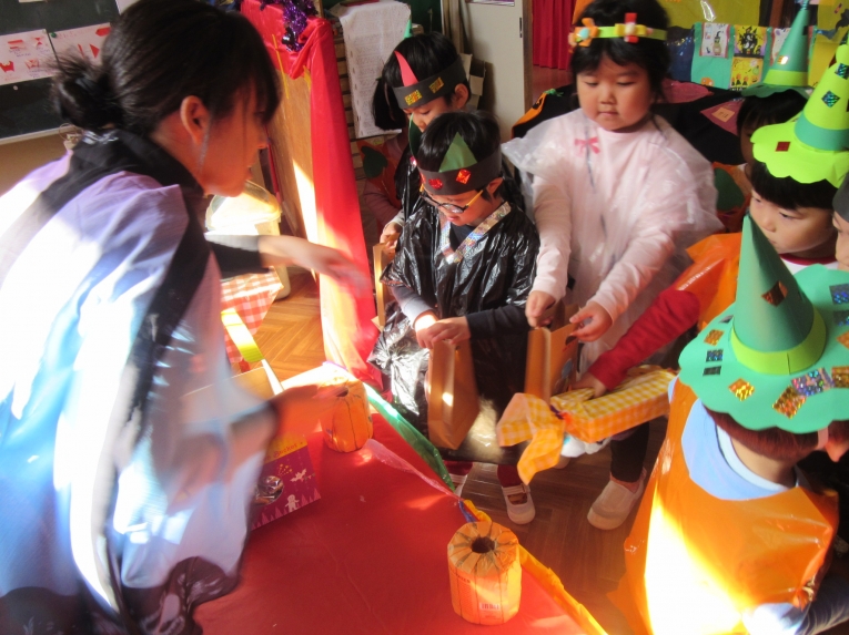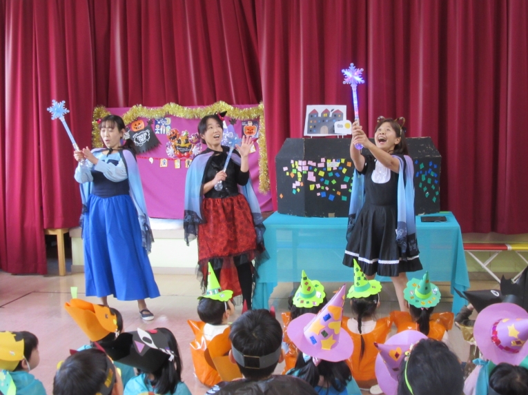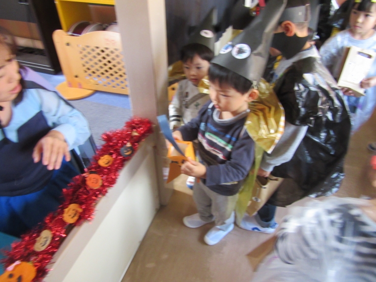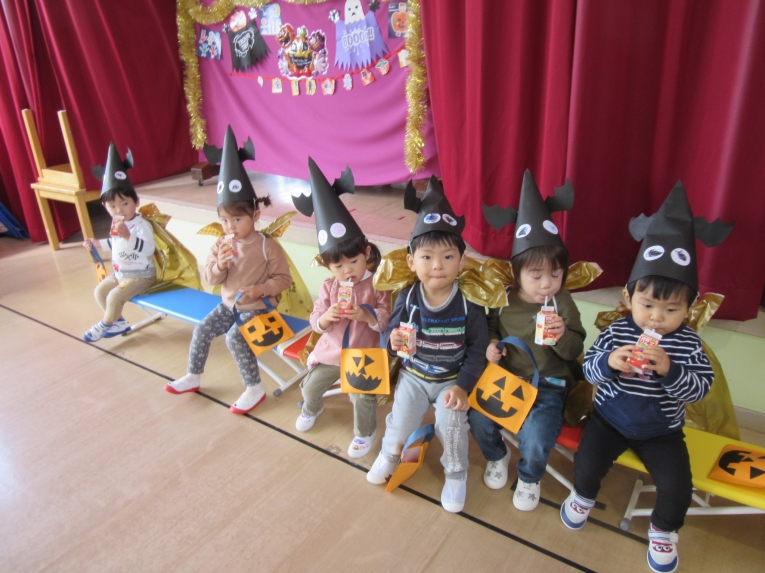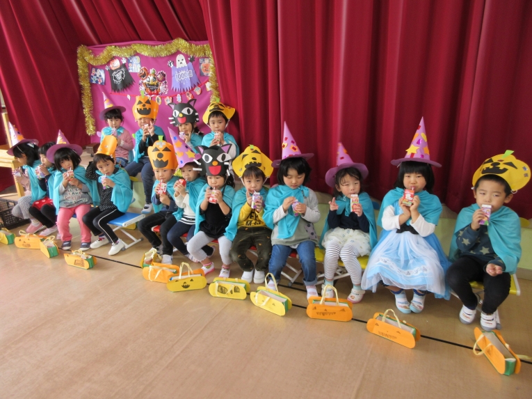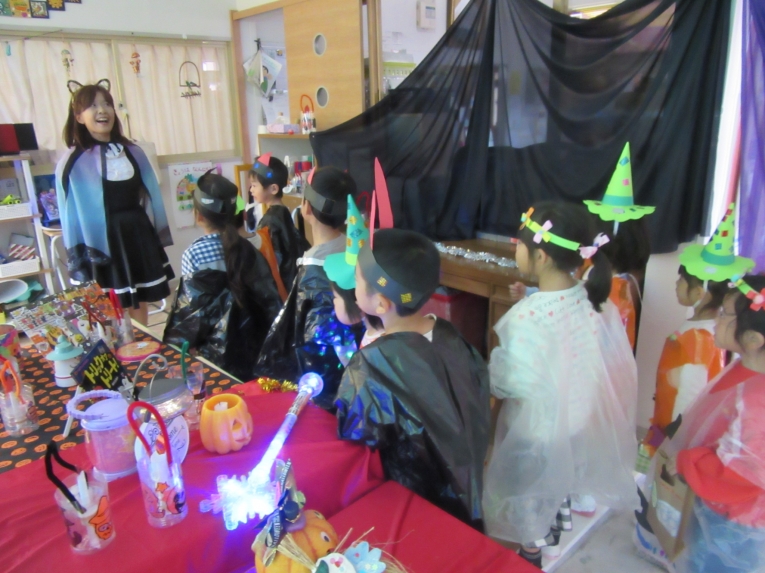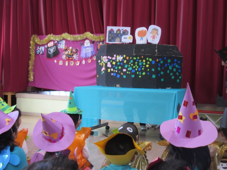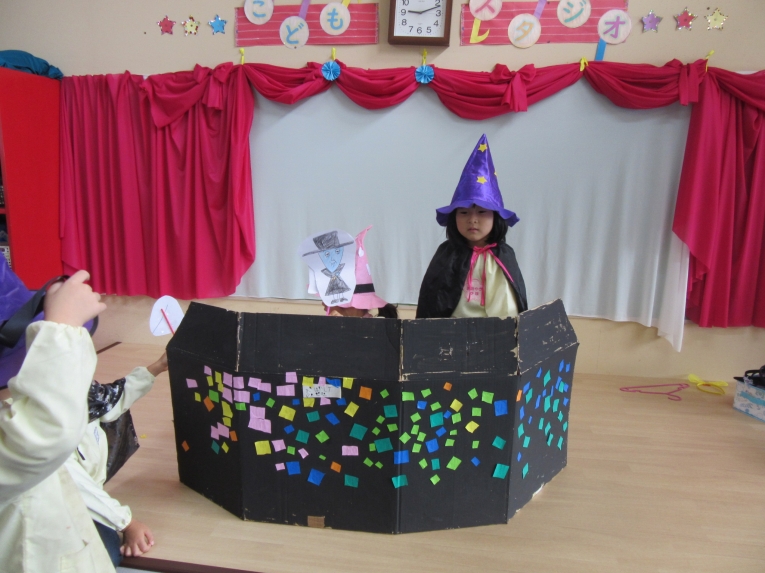 こどもスタジオでは、衣装を身につけ、「おかしなハロウィン」を踊ったり、年中さんから始まった「おばけマンション」のペープサートを演じたり、お客さんになったり・・・