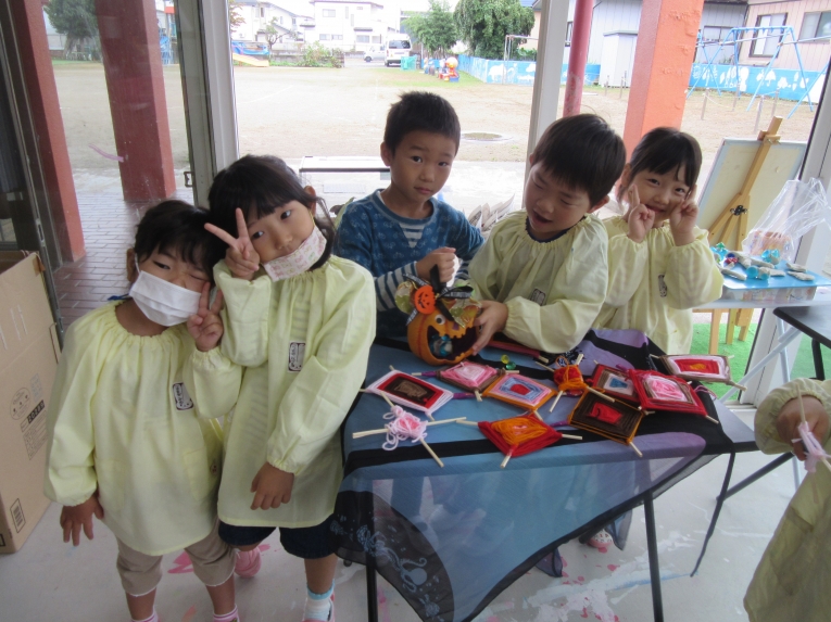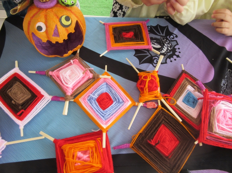 数日後・・・「あ!これ 蜘蛛の巣に似てるね」と気づいた年長さん。ちょうどハロウィンが近づいたこともあって、「蜘蛛の巣タペストリー」と命名して、アトリエに飾るとなんだかいい感じ~