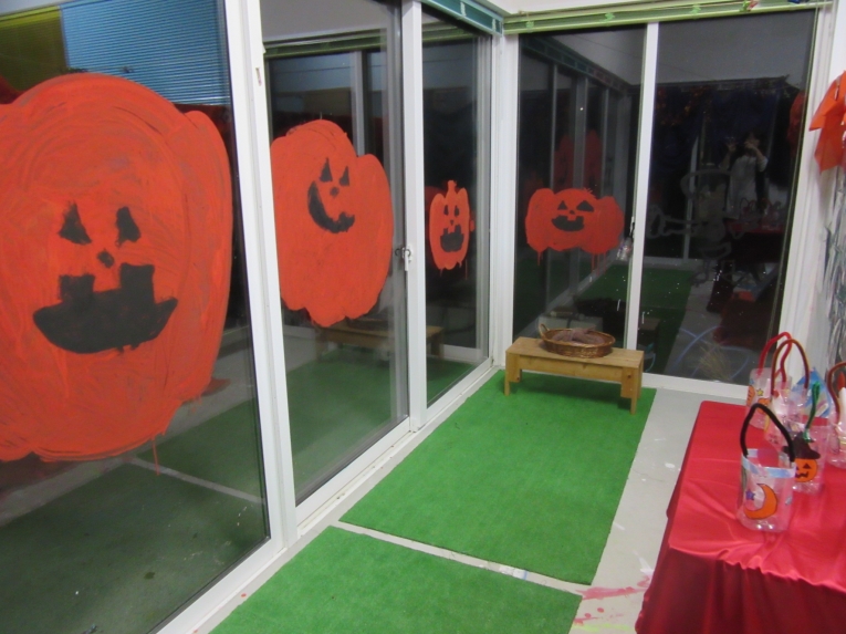 アトリエのガラス窓には、大きな大きな「ジャック・オー・ランタン」の登場!年中さんたちが描いたオレンジ色のかぼちゃに、年長のR君が見事な顔を・・!!「せんせ!がいこつ描いていい?」「もちろんよ♡」