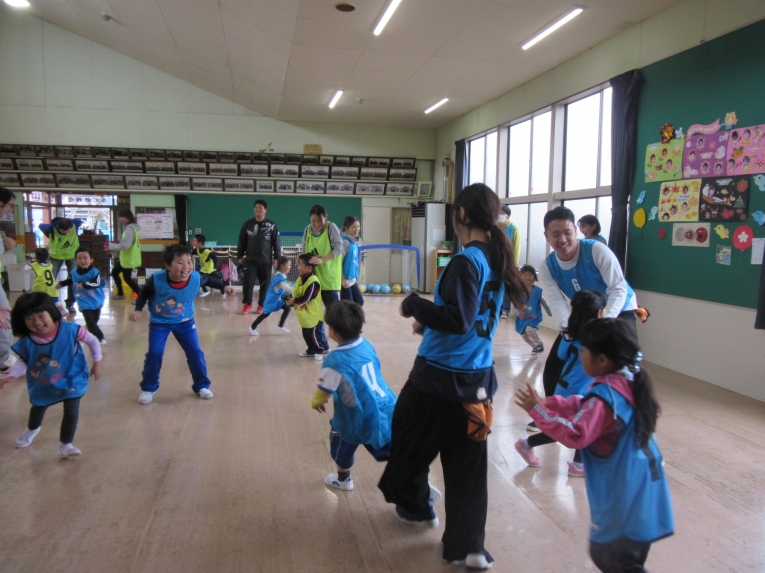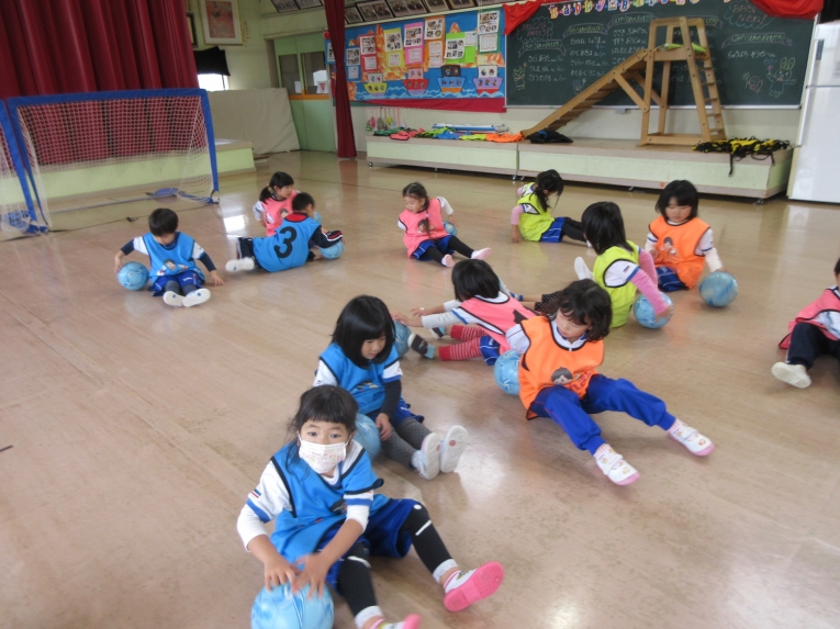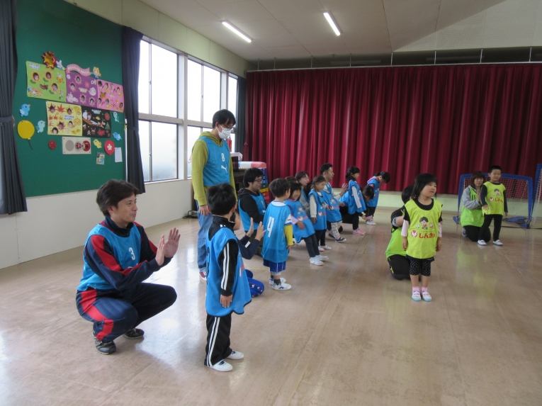 外で待つのは寒そうだったので、お部屋で絵本を読んで待っててもらいました。なんだかほっこりする時間でしたビブスに着替えて、早速スタートです!まずは、ウオーミングアップです!