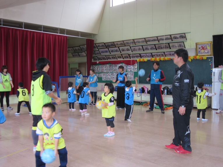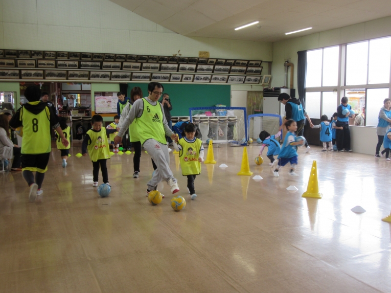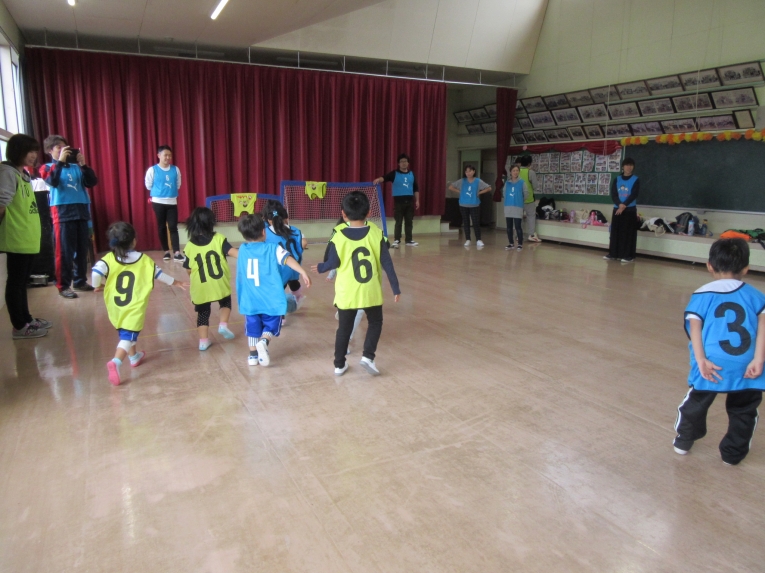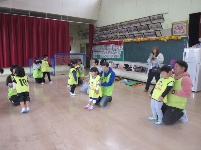 キャッチボールをして、親子でシュート練習もしたよ!最後は2チームに分かれて試合をしました!ボールを一生懸命追いかけたり、シュートしたり、みんな頑張りました!