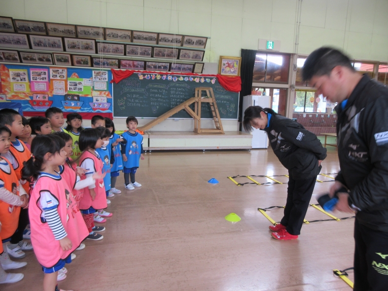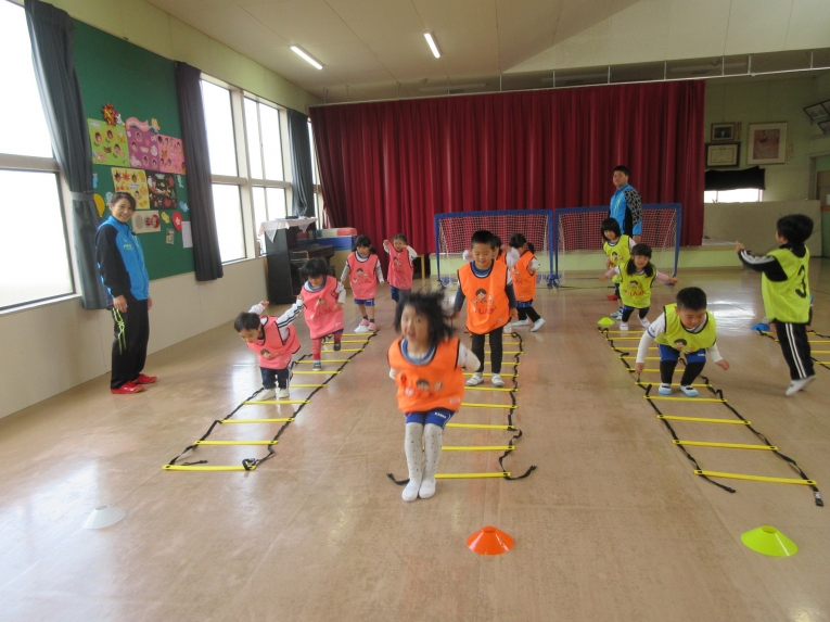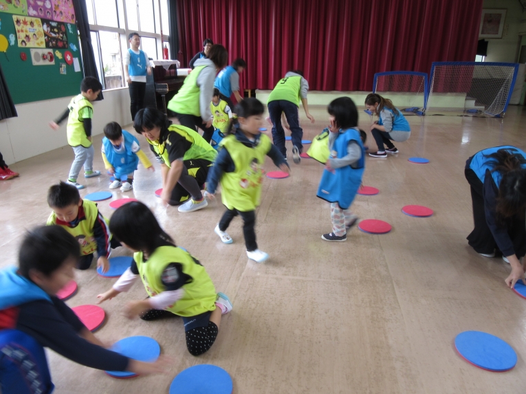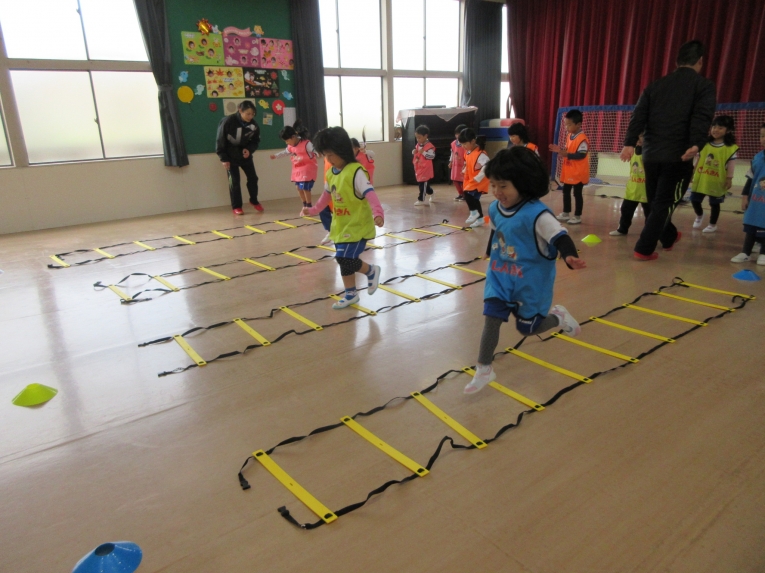走ったり、一つとばしてジャンプしたり、後ろ向きで走ったり、「できるかな~」「えーー?」なんて言いながら、がんばっていました!