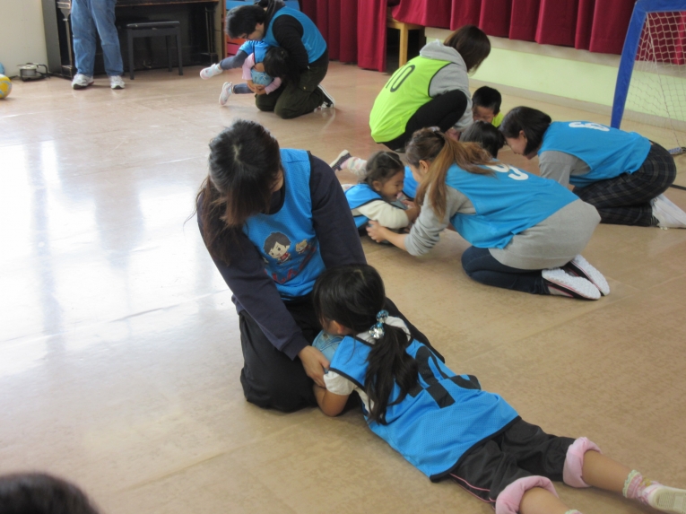 ボールを使って、お家の方と取り合いゲーム!いろいろなやり方があって、面白かったね!前回のサッカー教室でもお友だちと行いました