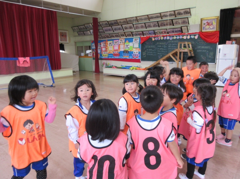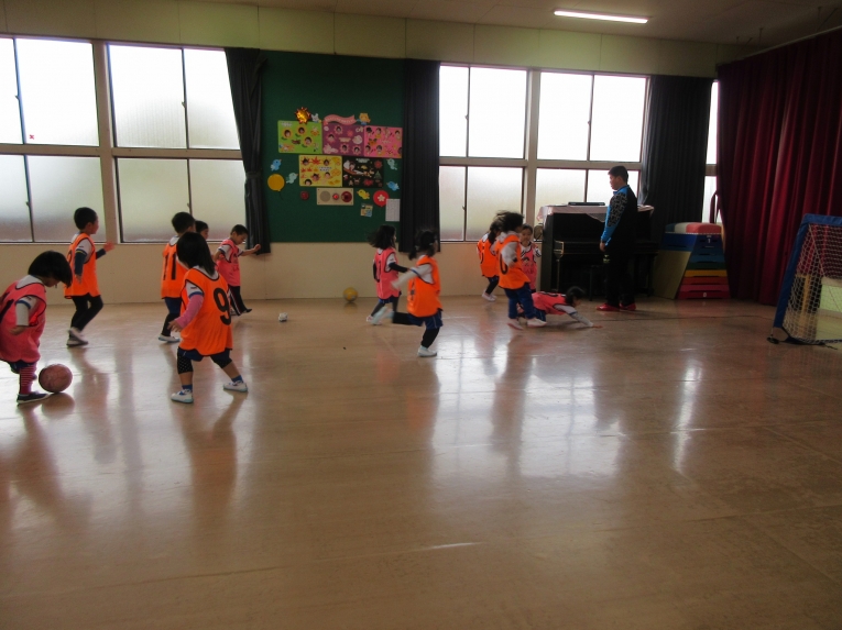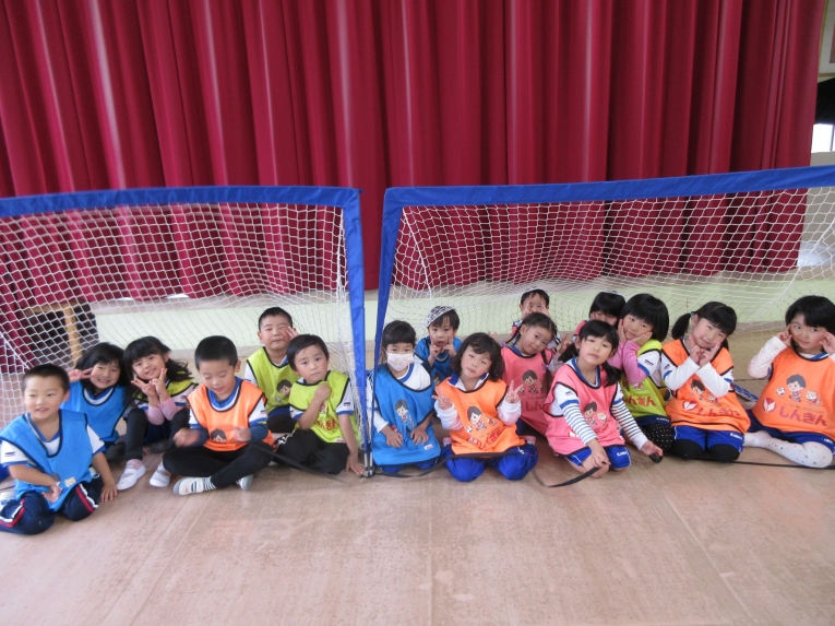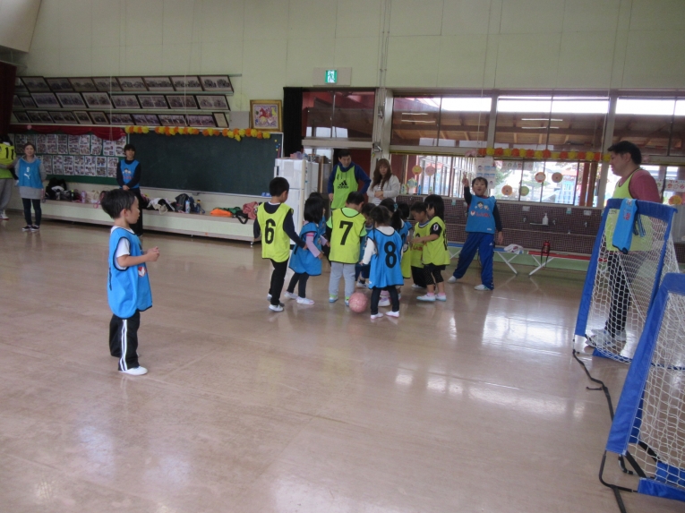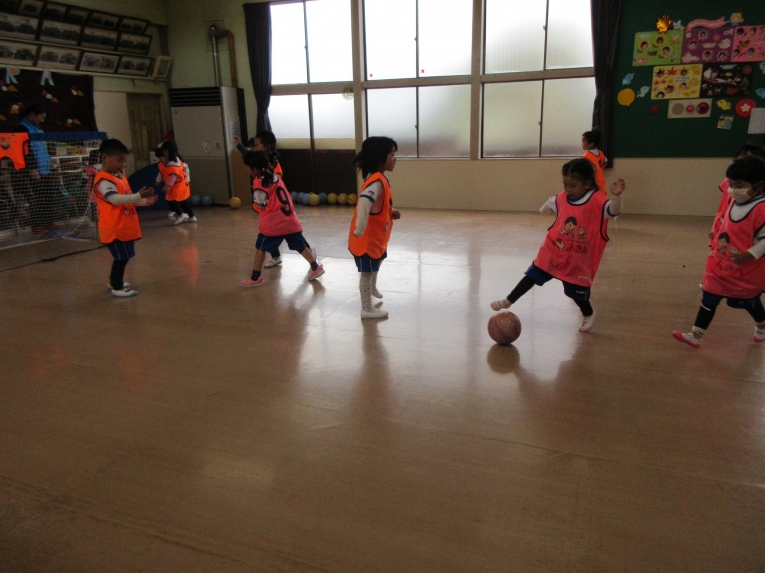 次はシュート練習!ゴールめがけて、シュートできるようになってきました最後は二つに分かれて試合をして、楽しみました