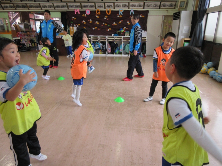 次はお待ちかねの?「ボールフィーリング」ドリブルや、投げてキャッチ、自分の体の周りをボールを転がしたりと、ここでも「出来た!」「見て!」がたくさん聞こえてきました!