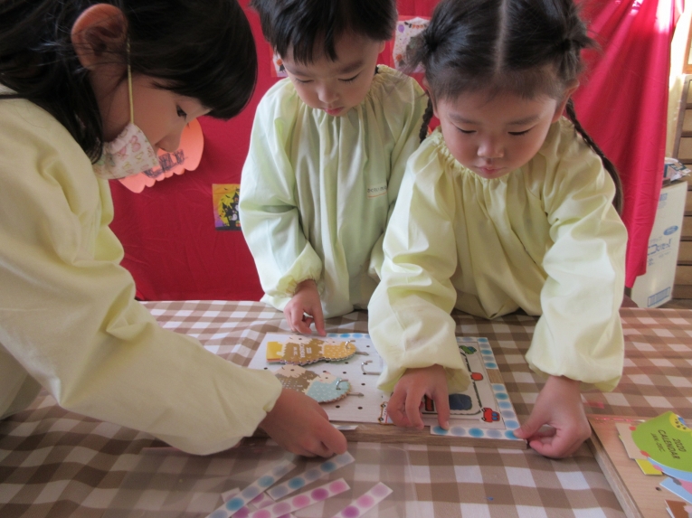 運動会が終わり、海がひと段落したある日、割りばしを組み合わせた土台に、毛糸を規則的に絡ませる「タペストリー」を、ワークショップに出してみました。「ちょっとむずかしい・・??」と言いながらも、真剣にチャレンジした子どもたちでしたが、段々に要領が分かりマスターすると、配色を考えたり、大きさを調整したりと工夫を楽しみ始めました(#^.^#)