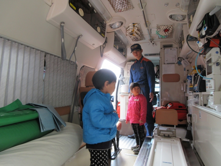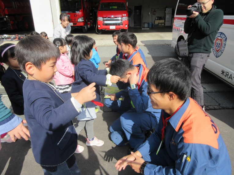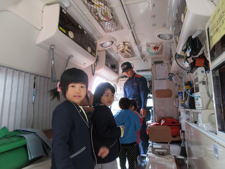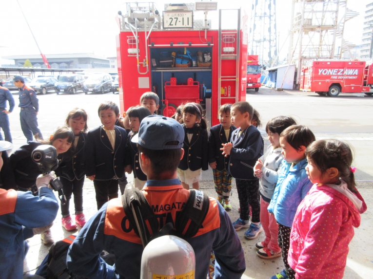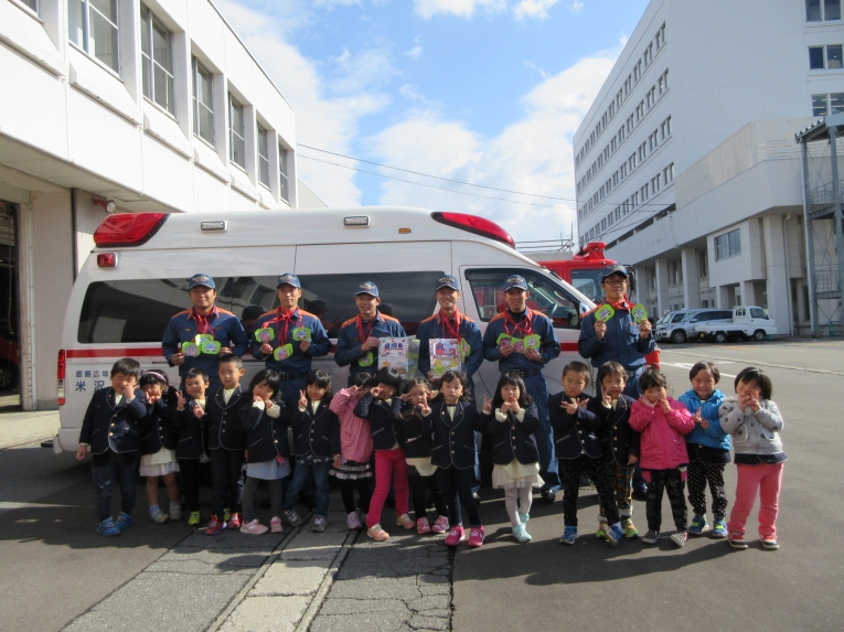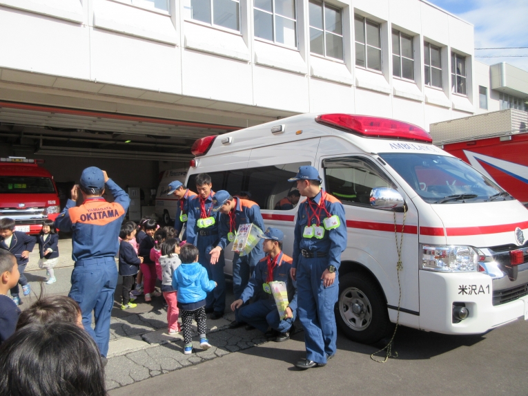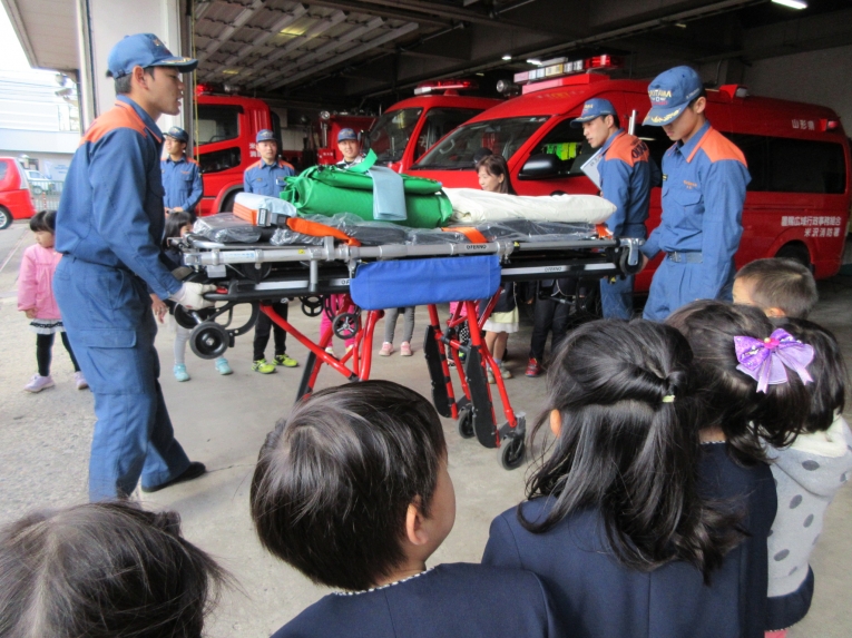 次は救急車の中を見せてもらったよ!ストレッチャーを出してもらったり、実際に救急車の中に入って見せてもらったり、貴重な体験をしました「質問はありますか?」と言われると、みんなで「はーい!」と元気いっぱい。「ホースは何センチあるんですか?」「25メートルです」「消防車はどこまで行きますか?」「米沢市内はどこまでも行きます」「はしごはどこまでありますか?」「後ろの市役所の屋根まで届きます」「わあーーー」「すごーーーい」と空をみあげるみんなでした