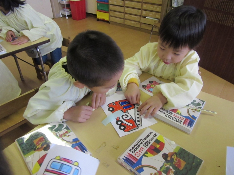 プレゼントは丸い小さなシールを貼り合わせ、「救急車」と「消防車」を完成させ、カレンダーを作成。救急車とはしご消防車の塗り絵をしてメダルも作りました。