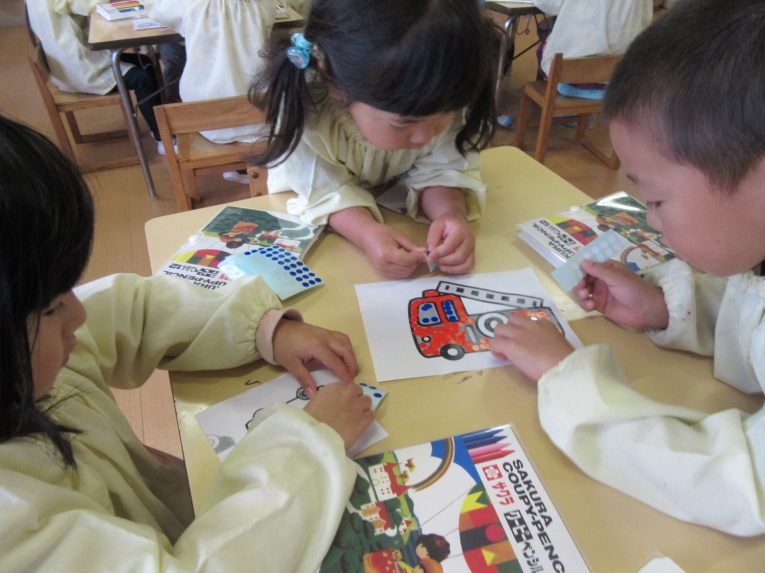 慎重に、慎重に、うん、袋になってきたね!次は「七五三」をなぞりながら色塗りをしたよ!なんと、ゆき組さんは、自分で書いたんだって!
