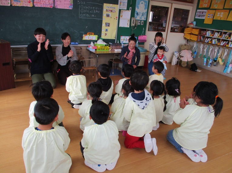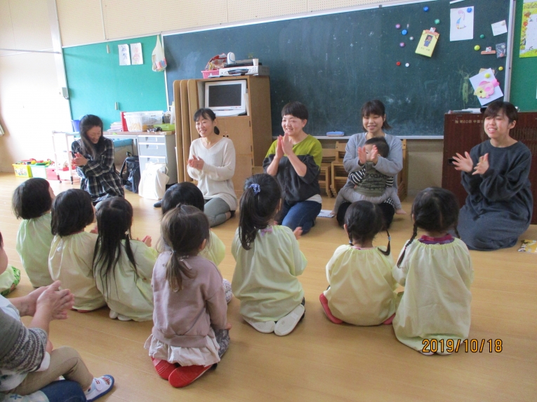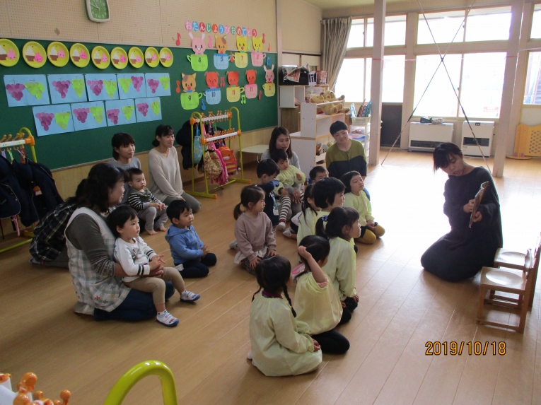 大型絵本や、エプロンシアターも♡ ママたちのあったかい語りかけに、ゆったりほっこりの子どもたちでした。