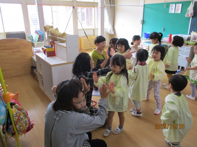 はじまるよ♪ はじまるよ♪ 初めて見るママたちの手遊びに目をまん丸なみんな・・