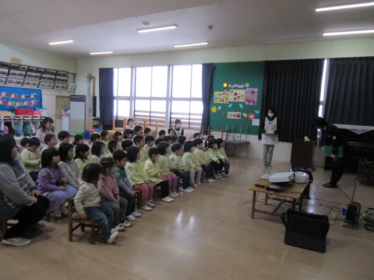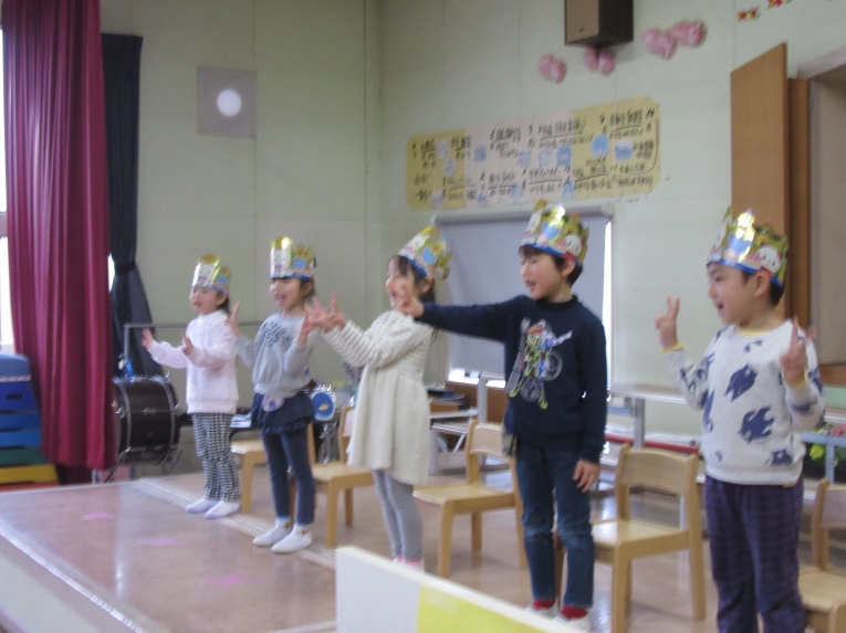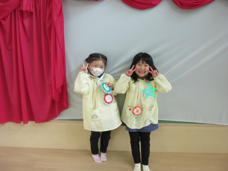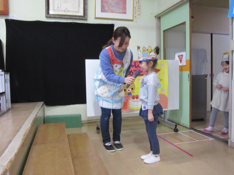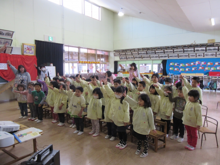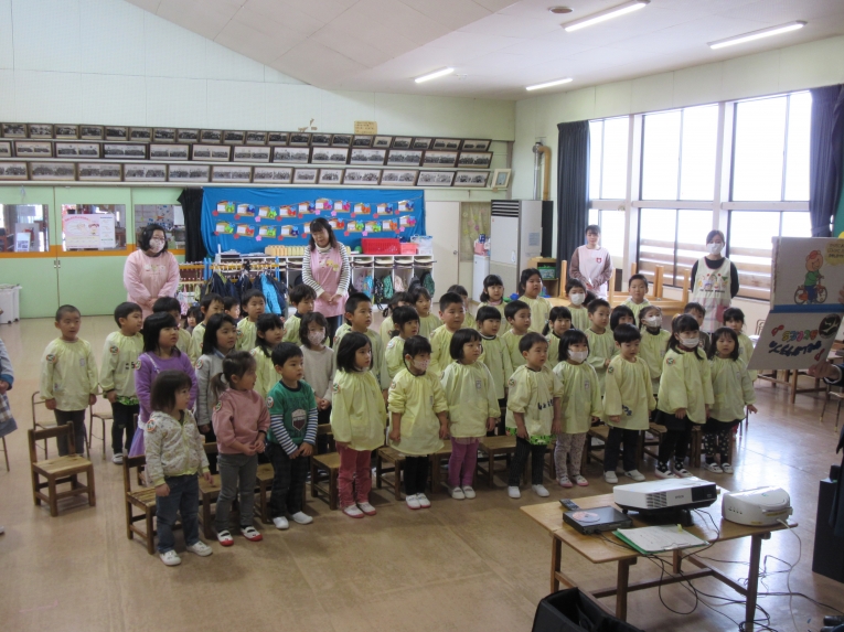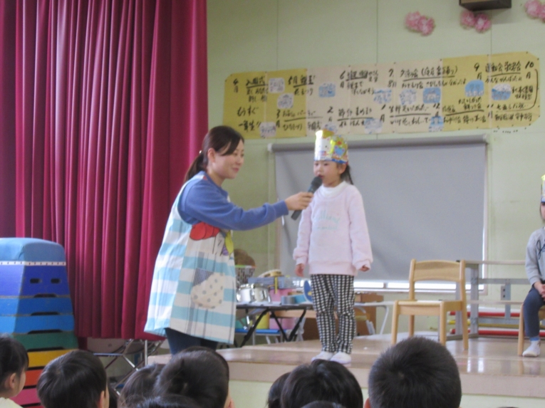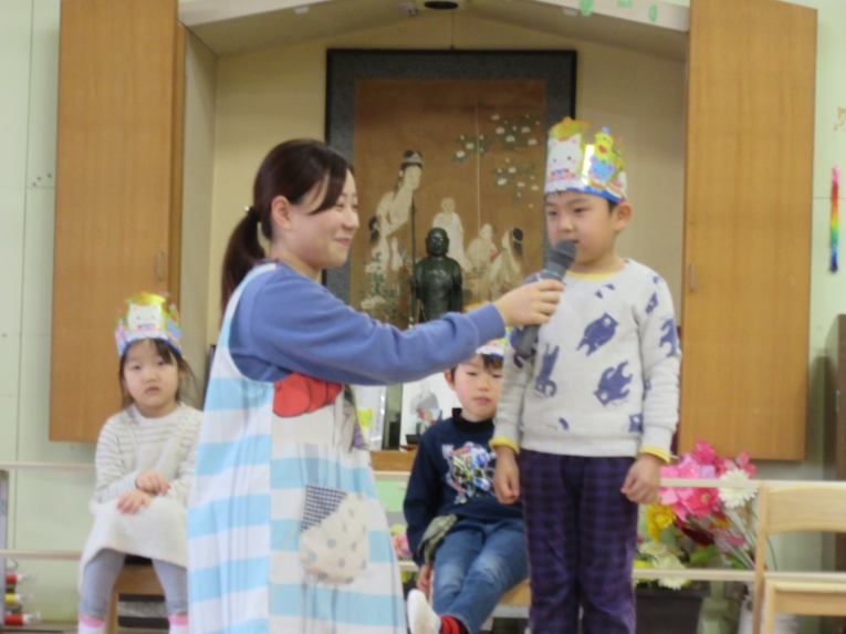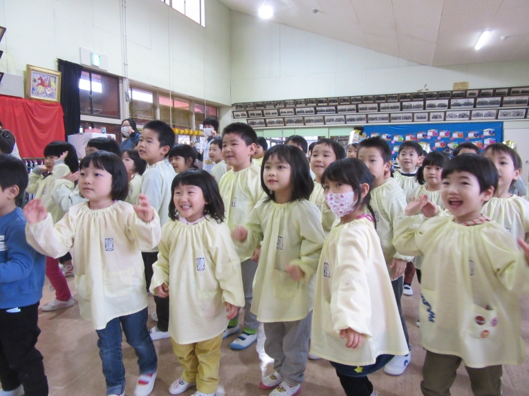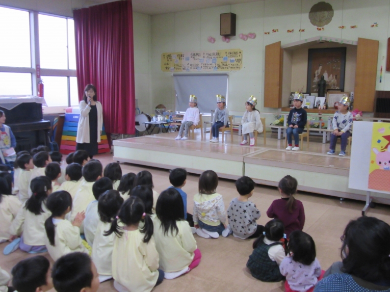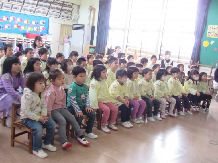 今回も理事長先生からの質問コーナーがありました!もうすぐ小学生になるということで、自分の通う小学校と小学校に行ったら頑張りたいことを質問され、ひとりずつ答えることができました頑張りたいことでは「算数を頑張りたい」と答える子が多く、理事長先生から「頑張ってくださいね」と応援してもらいました