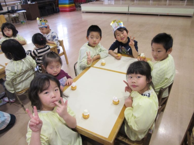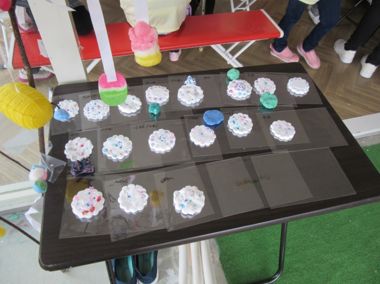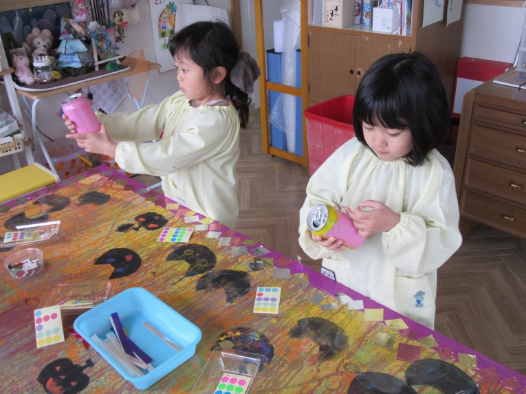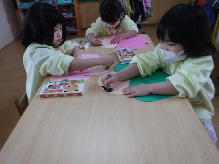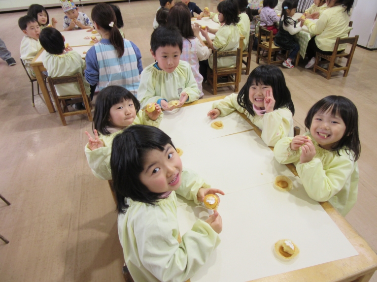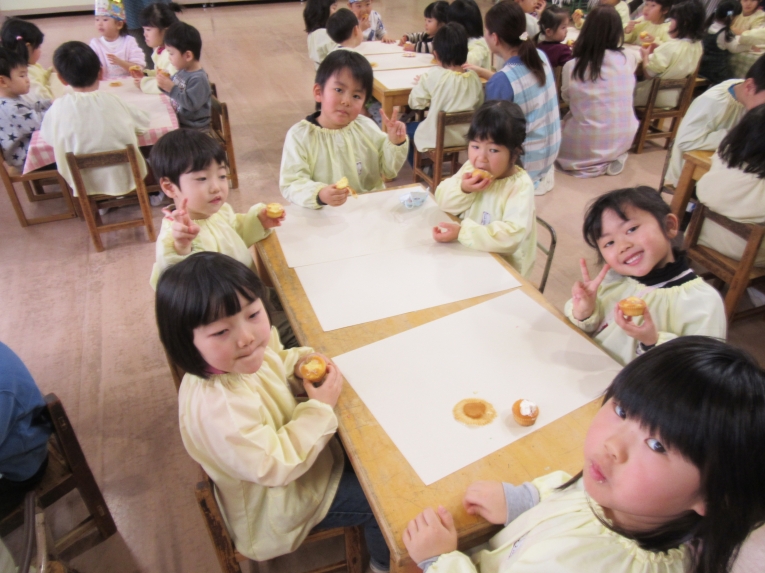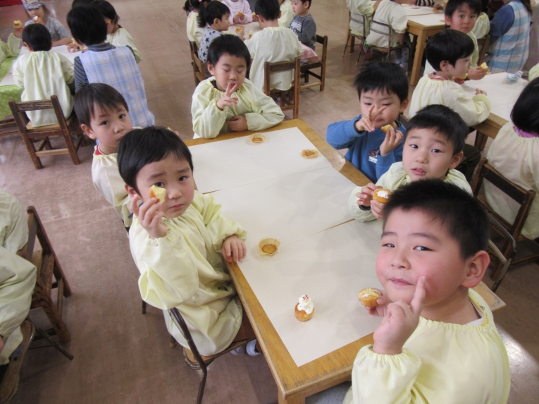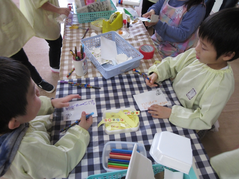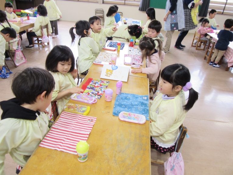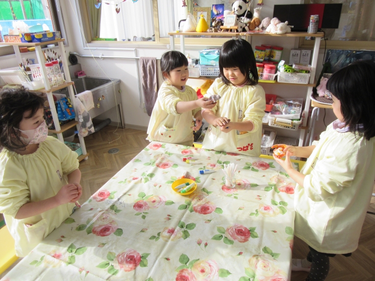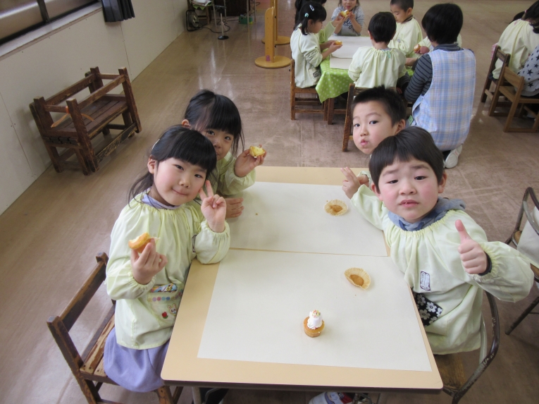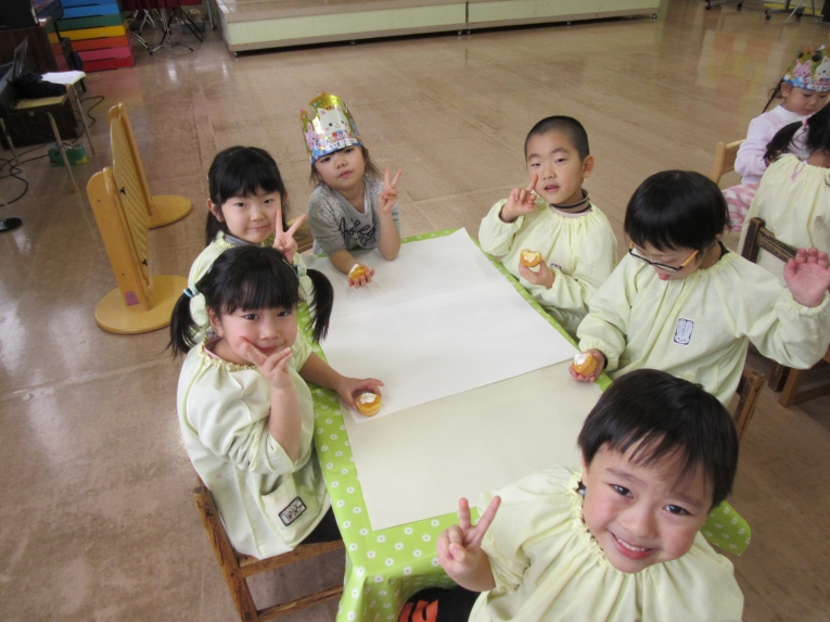 描いた後は、「食べてみよう」と言うと、「いいの!?」と笑顔机の上をきれいにして、みんなで食べました!