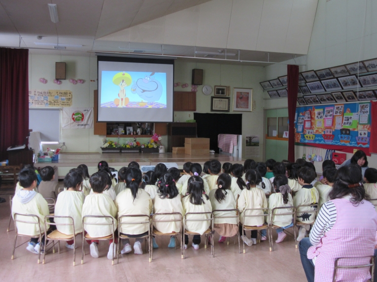 その後、お楽しみの映写会でした「アラジンの魔法のランプの交通安全」と「三太郎とかぐや姫の交通安全」
