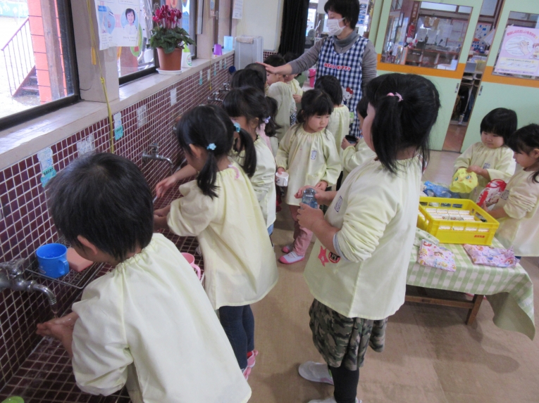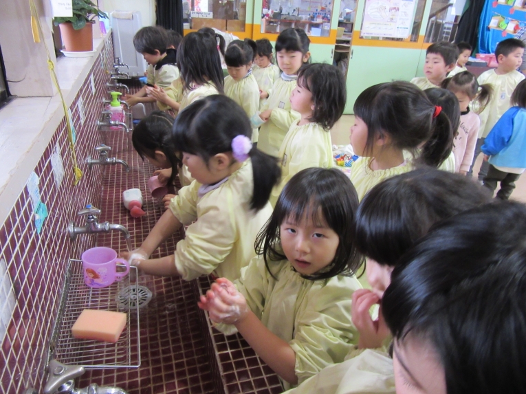 年長さんが、リードしてくれて、手洗いうがいや、給食準備も一緒に・・・
