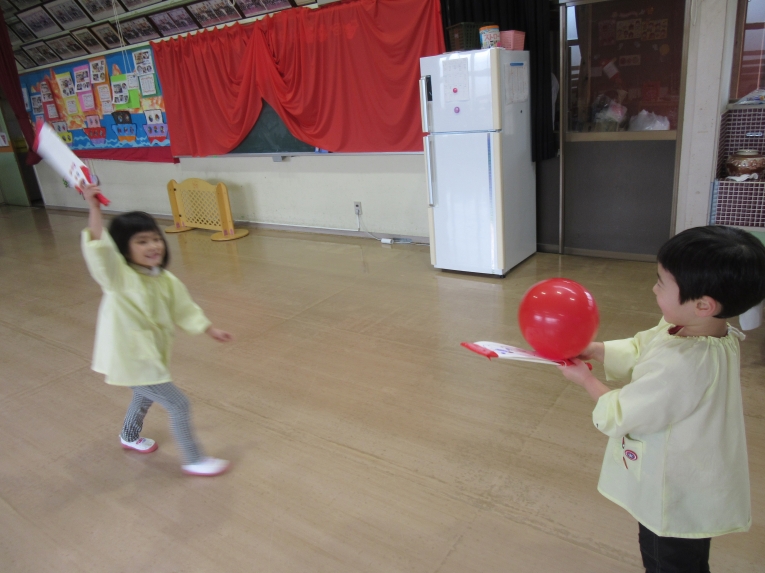 牛乳パックを使って、羽子板づくりMY羽子板で羽根つきだぁ!!風船でポンポン楽しんでます!