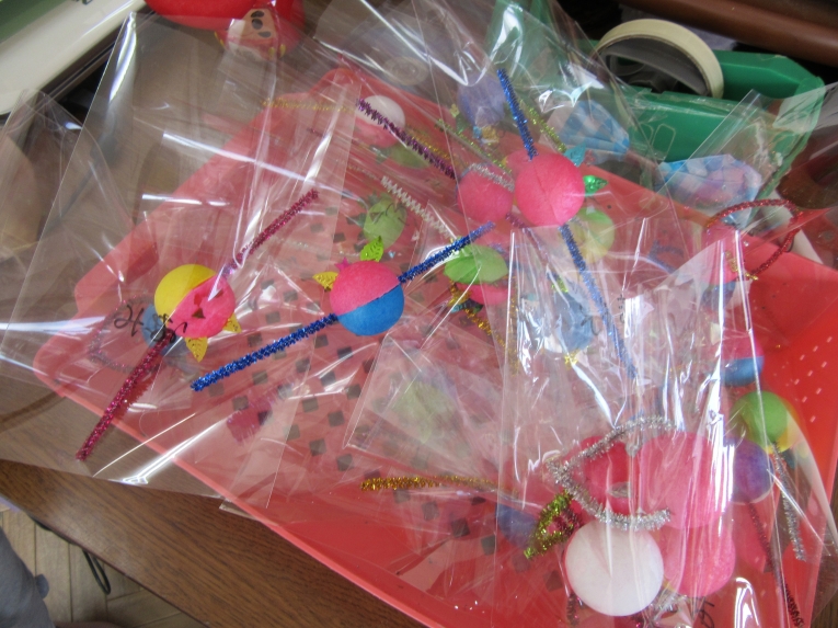 手作り楽器・・・ 色とりどりの缶(ふえ)やペットボトルたち(太鼓・マラカス)