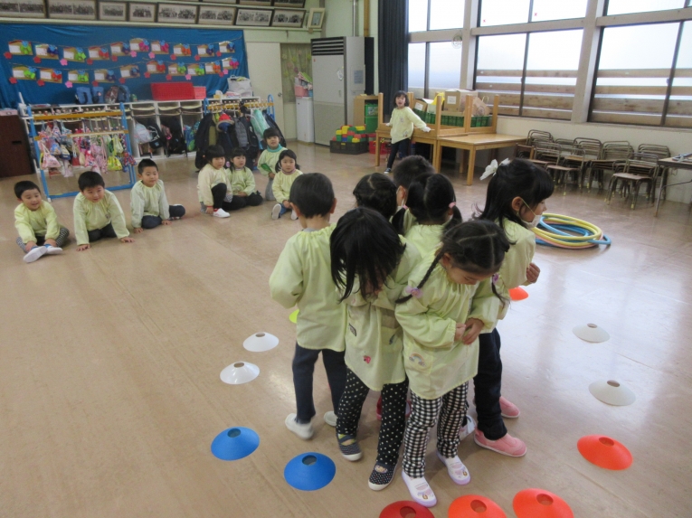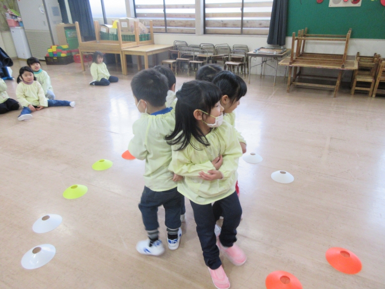 体を動かして遊ぼう♪ 「おしくらまんじゅう」を楽しみました!みんなでくっつきあって、尻相撲大会