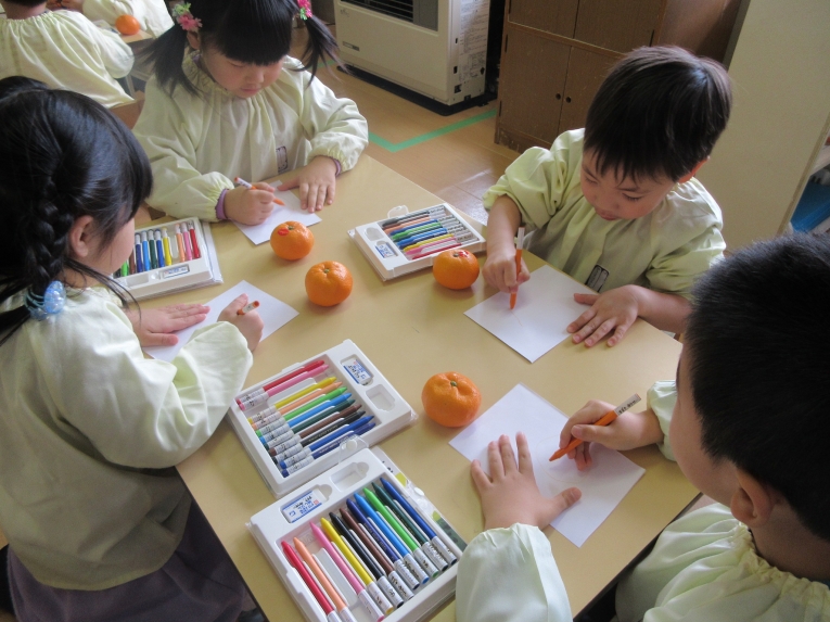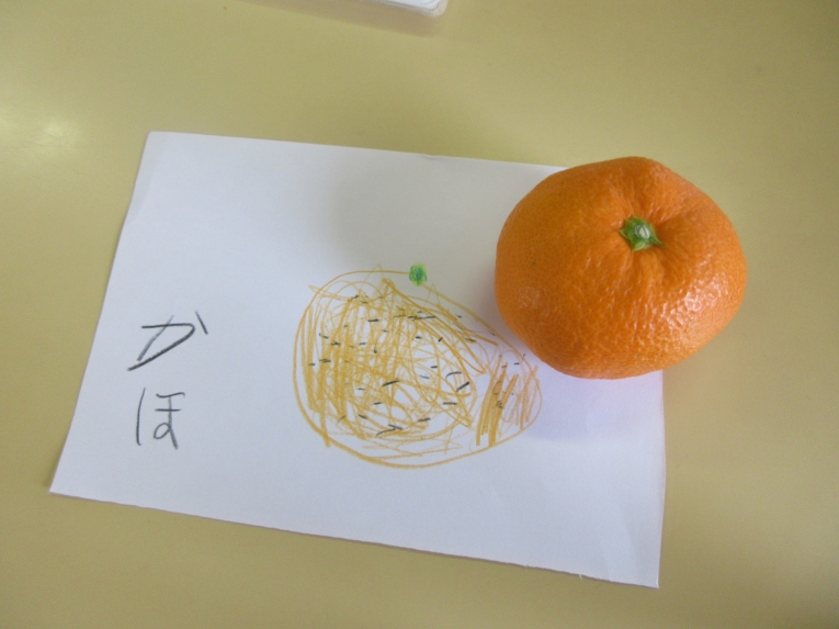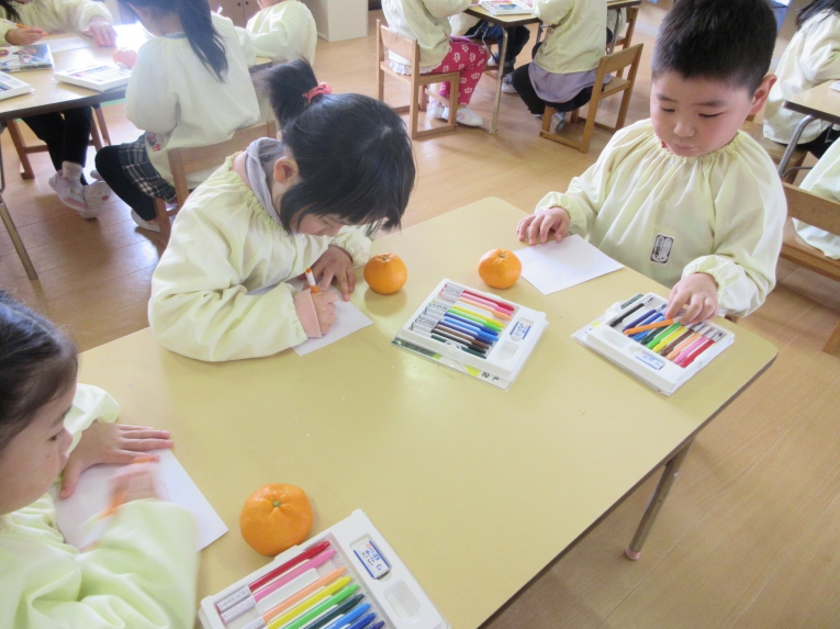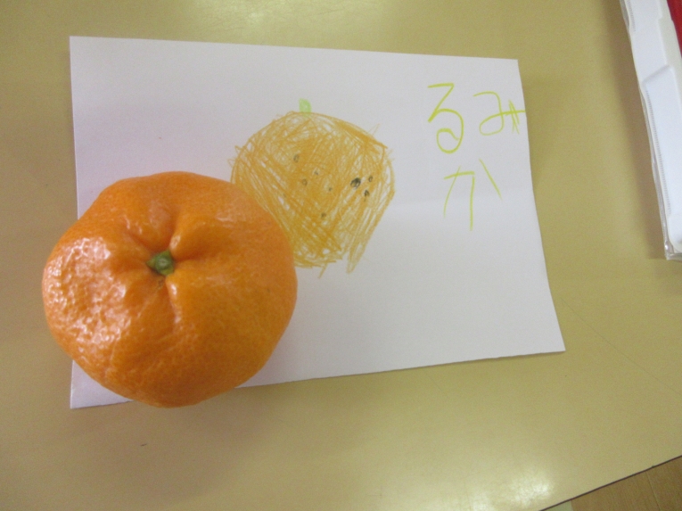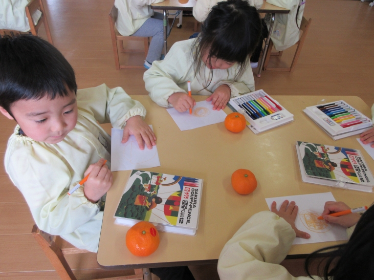 「みかん」の写生に挑戦しました手に取ってみたり、においをかいでみたり、みかんとにらめっこしながら描いてみました