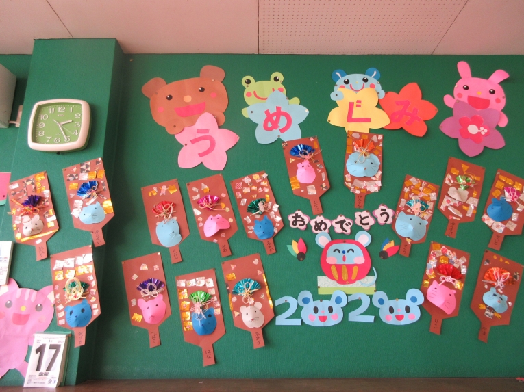 羽子板を作って、羽根つきやコマ回し、かるた取りやすごろくと楽しい遊びをする子どもたちです。うめぐみでは、年末に新しい年の王様、「ねずみ」の羽子板を作り、新年を迎えました