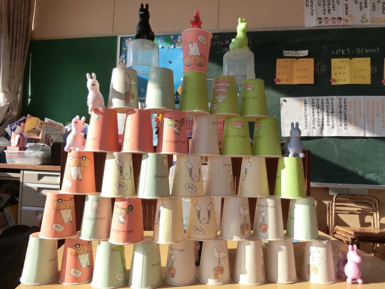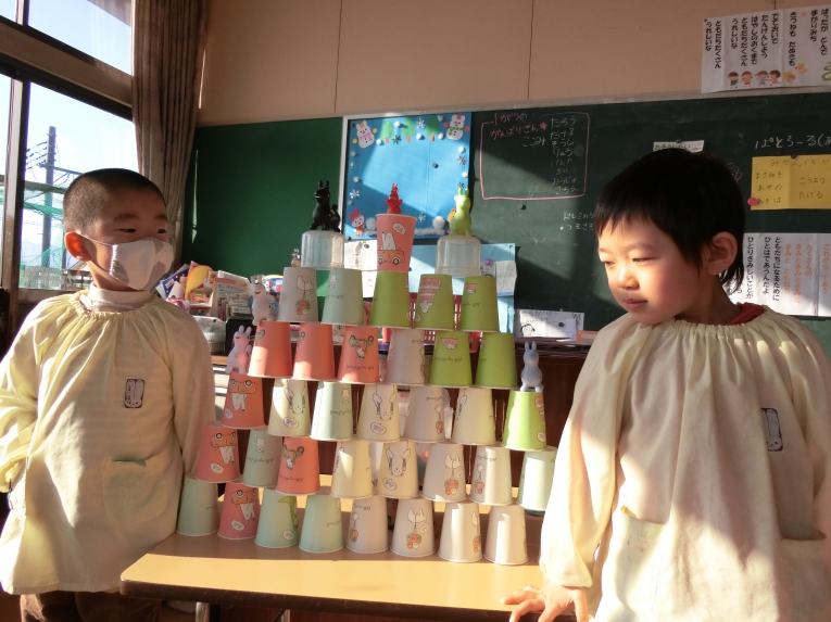 保育室では、カルタ取りやコマあそびでお正月遊びを楽しみ、現在はおままごとと紙コップタワーづくりに夢中になっています紙コップタワー作りでは、お友達と協力しながら日に日に新しいアイディアで遊び進め、出来上がった時には毎回「できたー!」と大きな声で喜んでいます