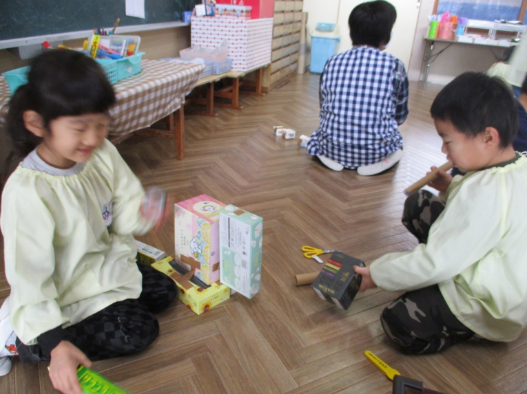 遊びの中でも、手作り楽器を作って楽しむお友だちもマラカス、ギター作ったよ